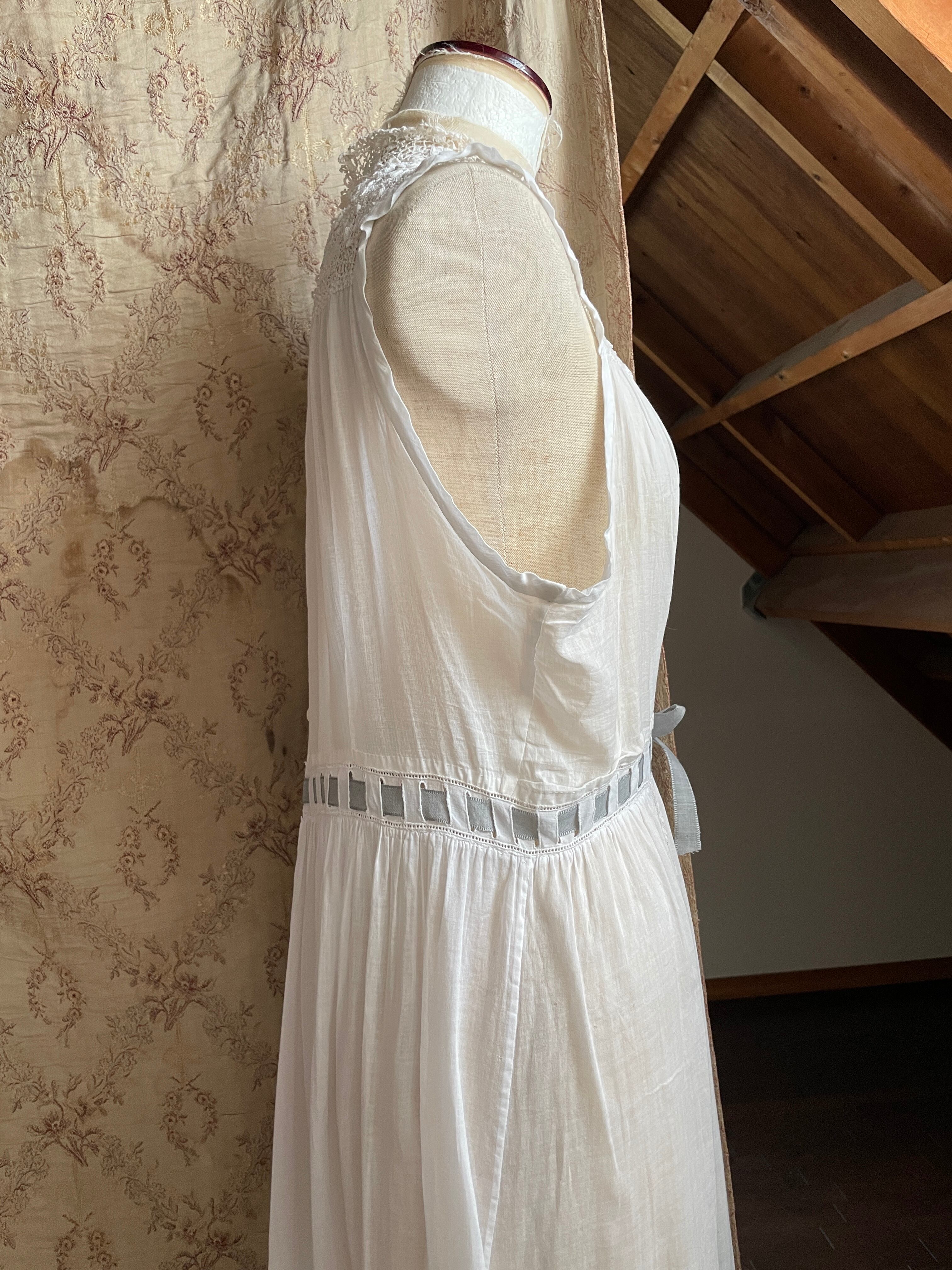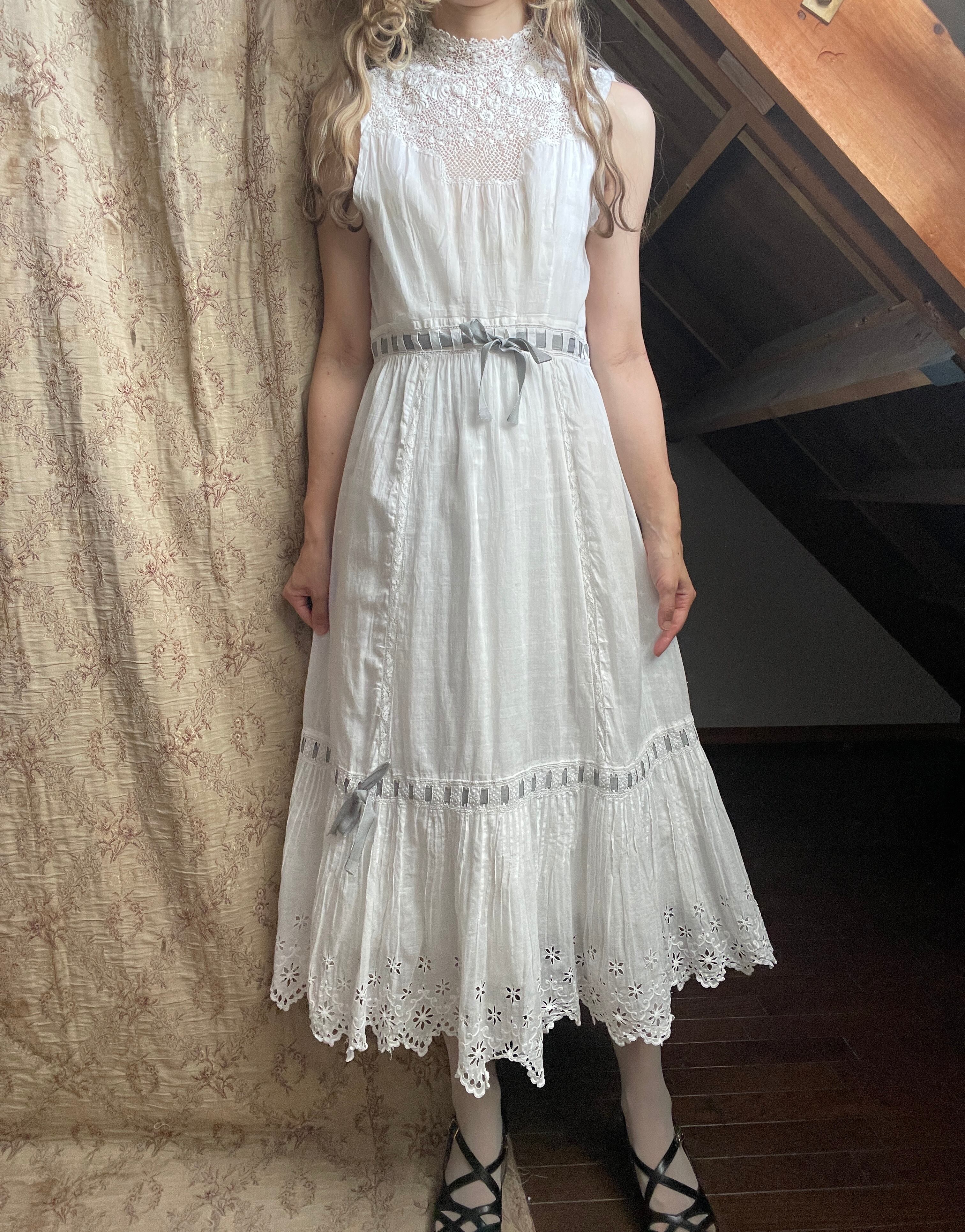 フランス買い付けの胸元飾りと、カットワークが素敵なはぎれを合わせて1枚のドレスにremakeしました♡