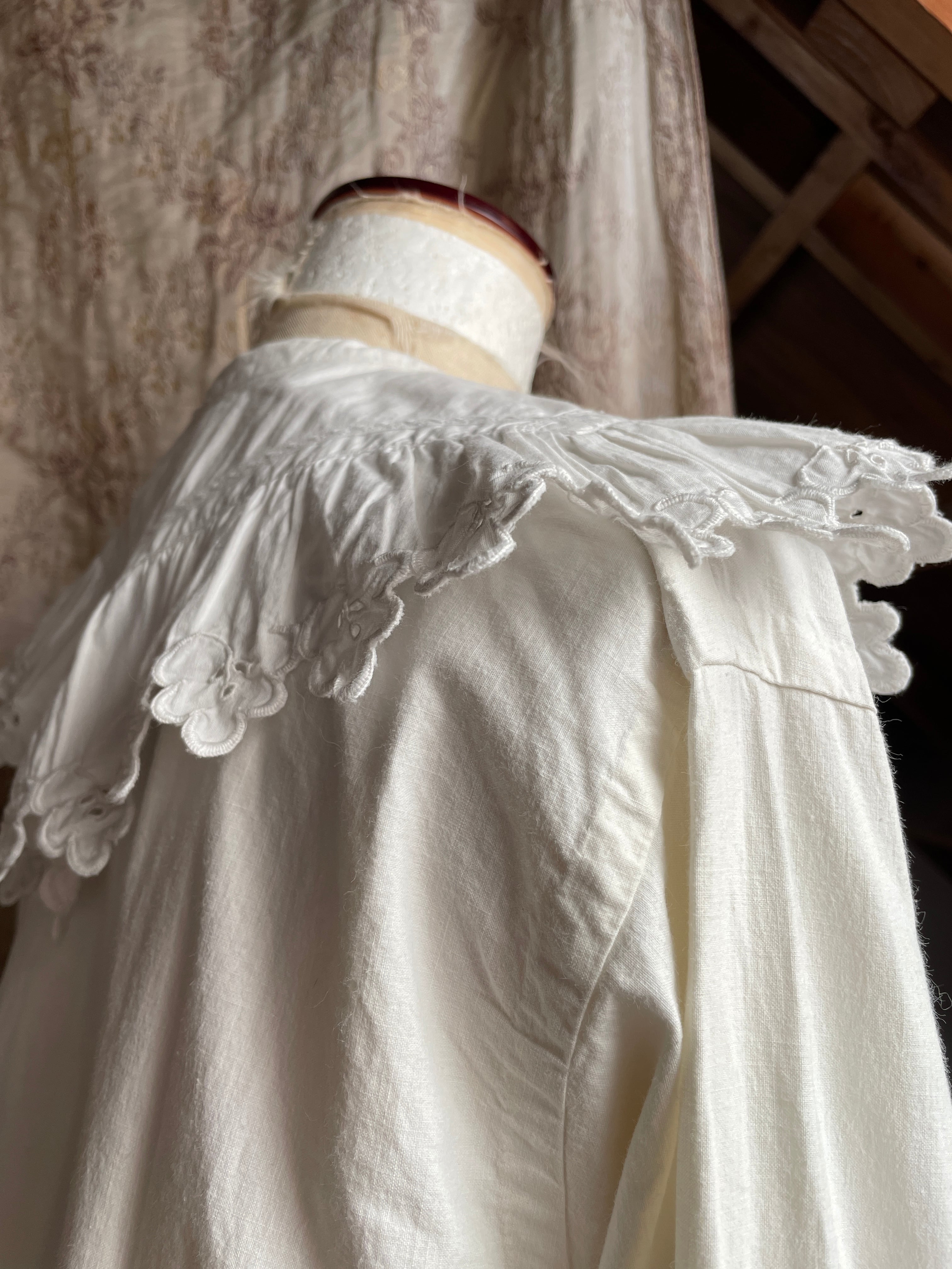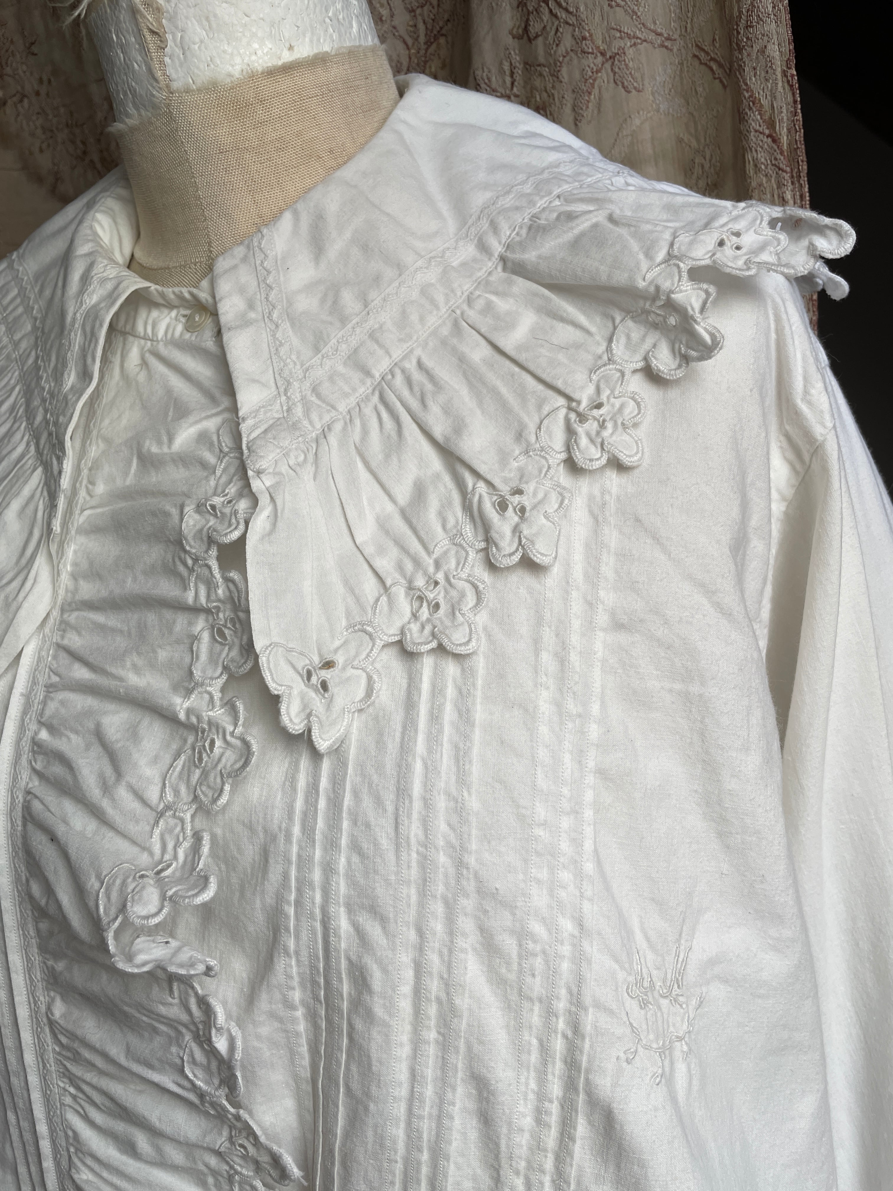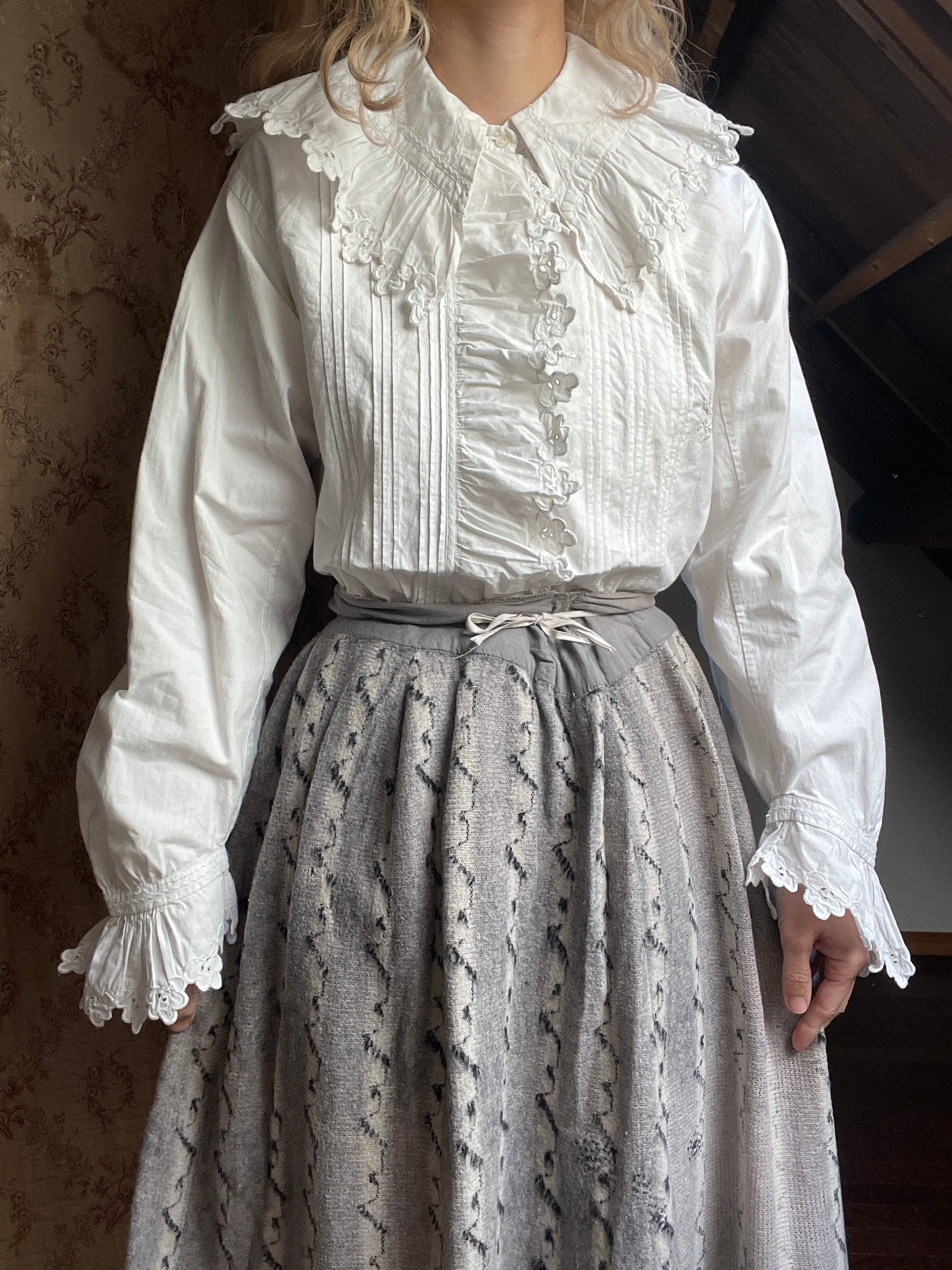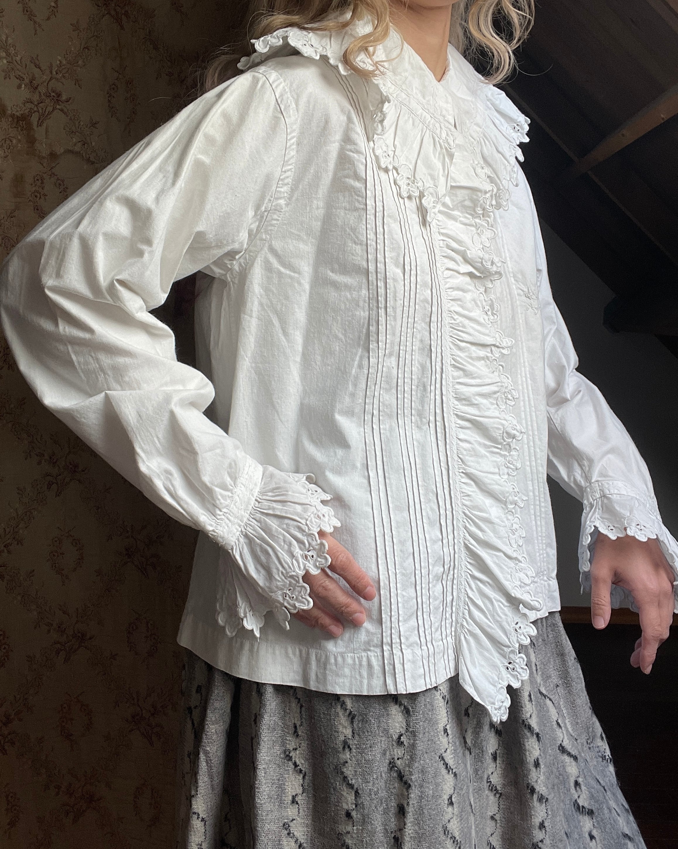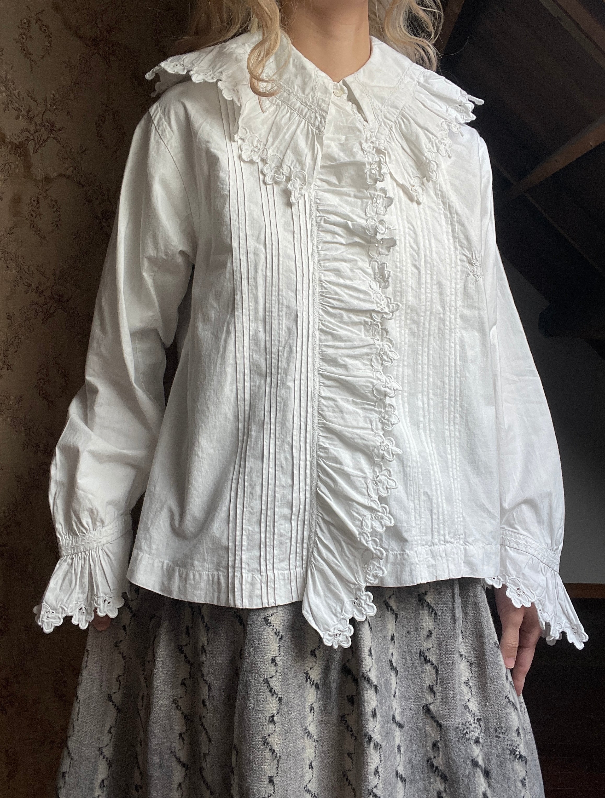 存在感たっぷりの衿は、ふちどりがお花の形にカットワークされていてさらにときめきます♡生地は張りのあるコットンでしっかりとしており、これからの季節はニットカーディガンやノースリーブドレスとの合わせが楽しめそう♡