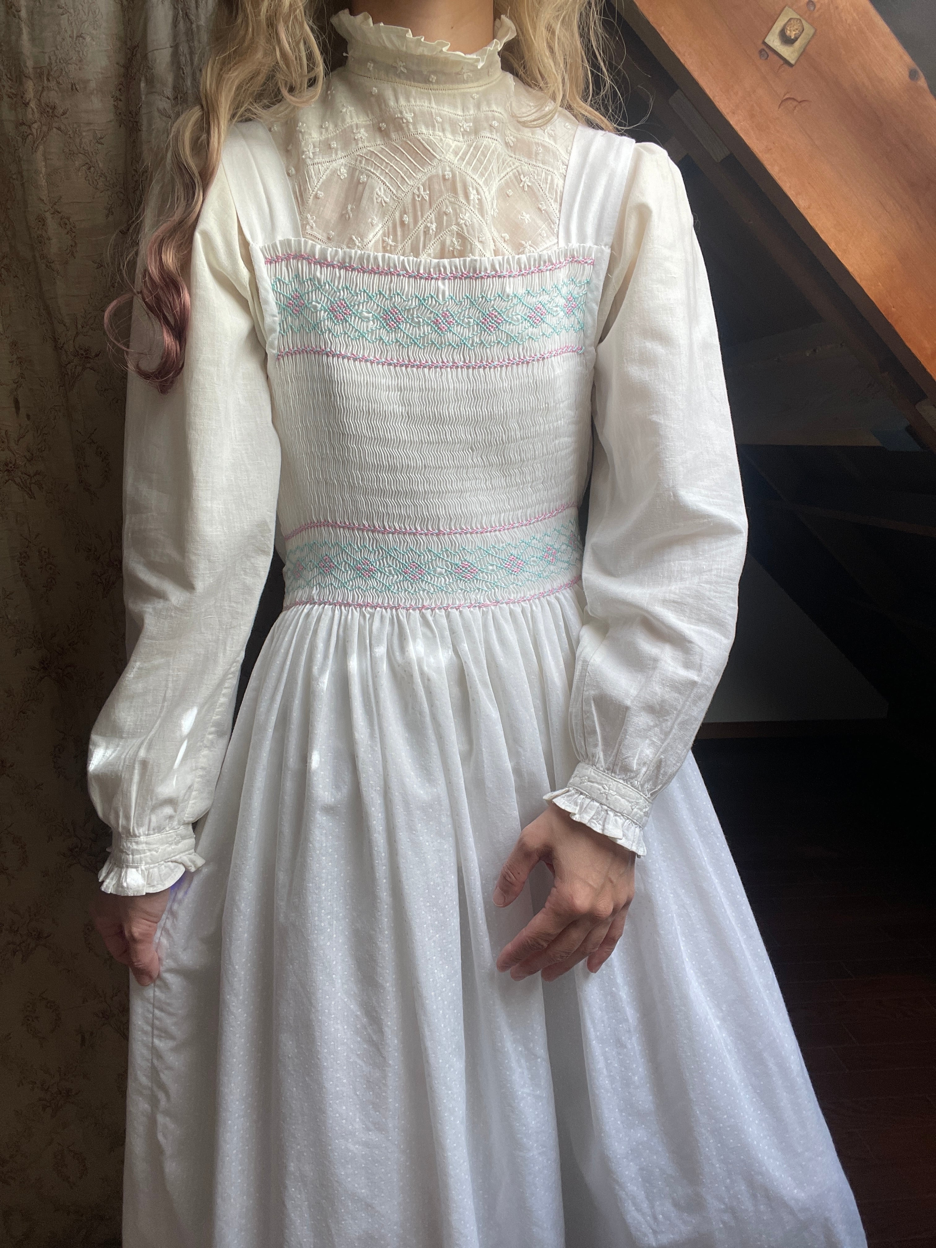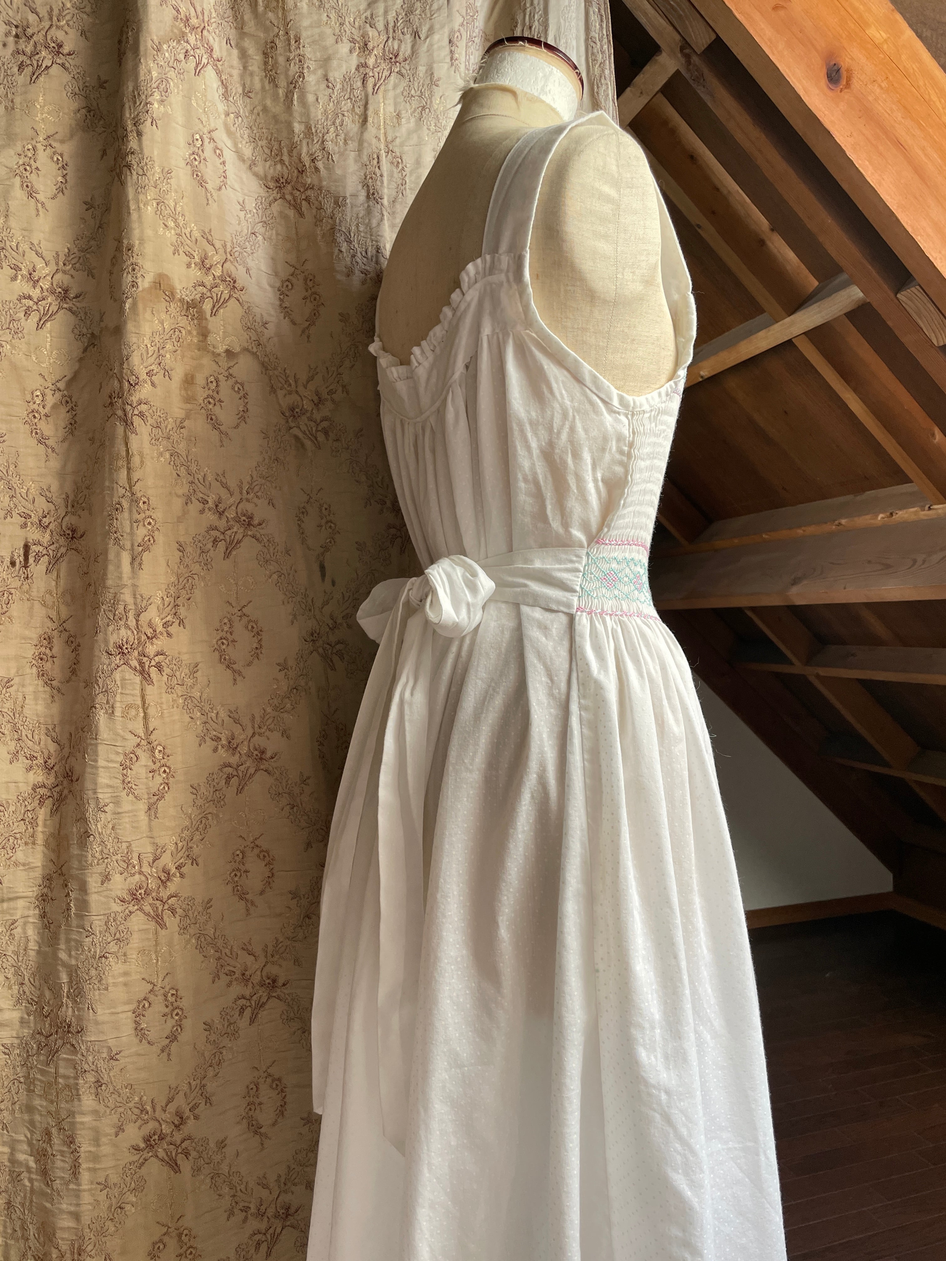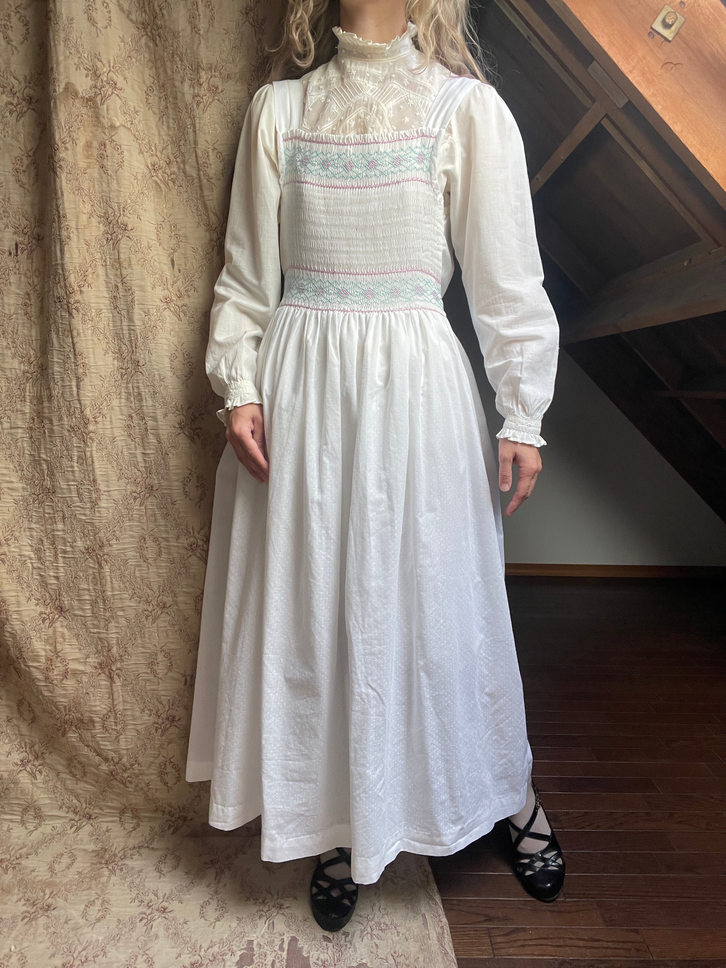 フランス買い付け、胸元部分のミント×ピンクのスモッキング刺繍がとてもかわいいドレス♡