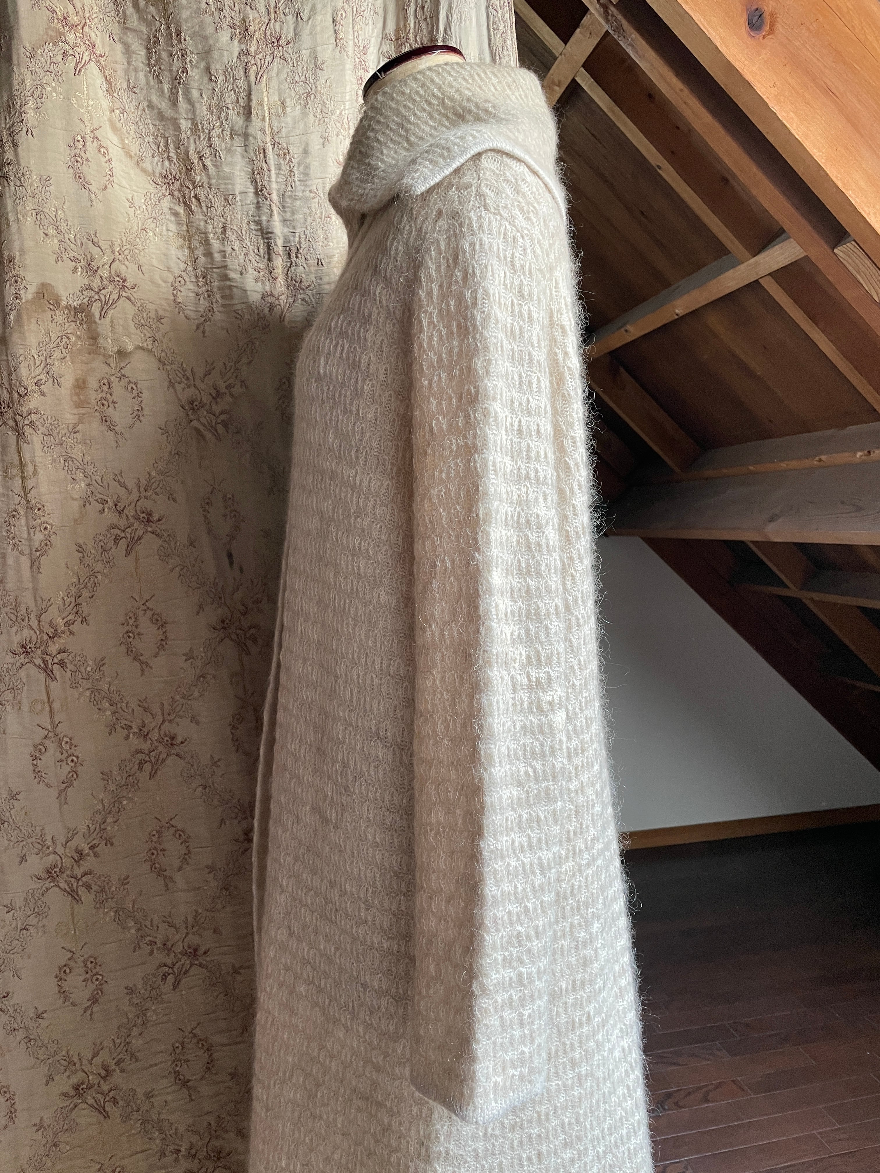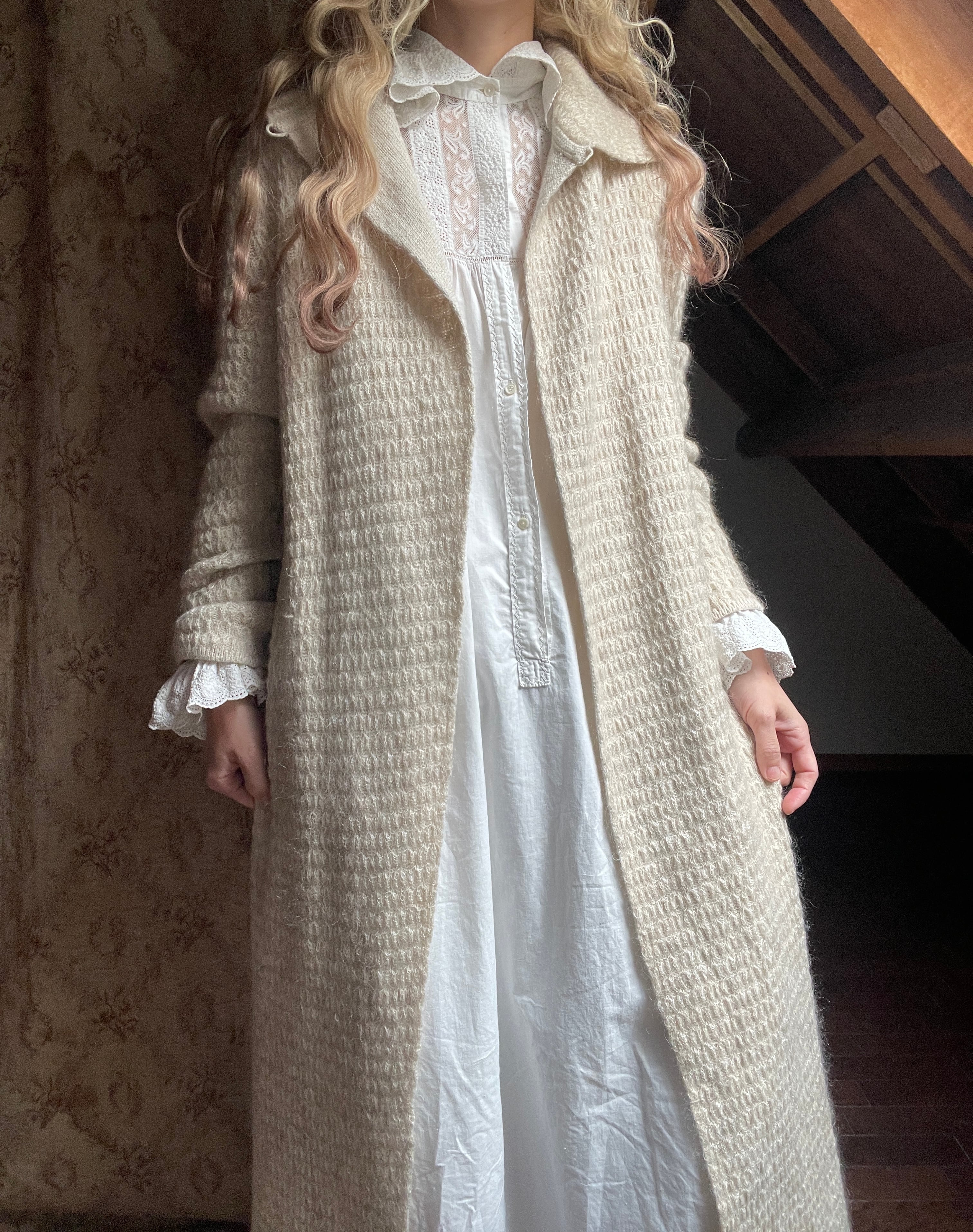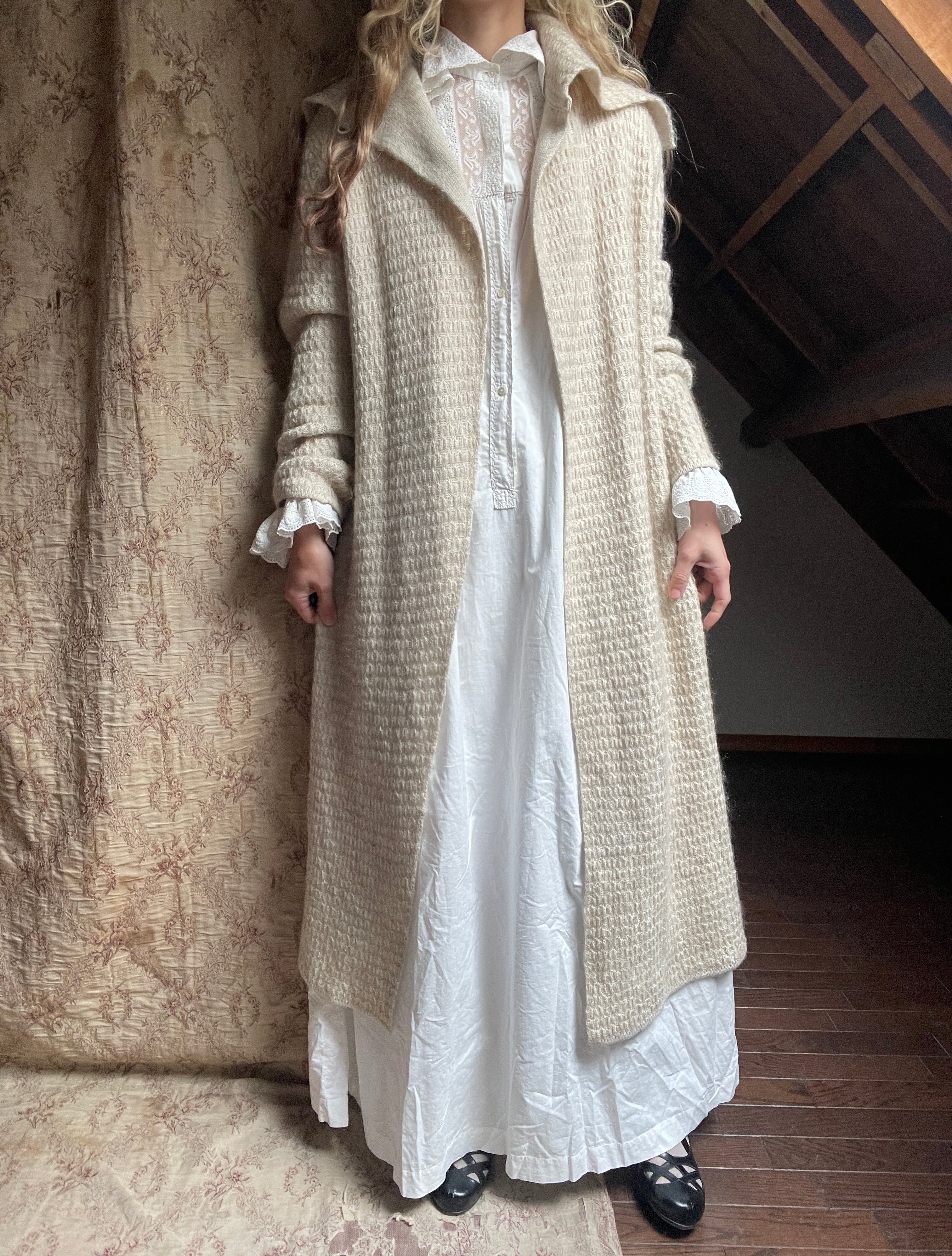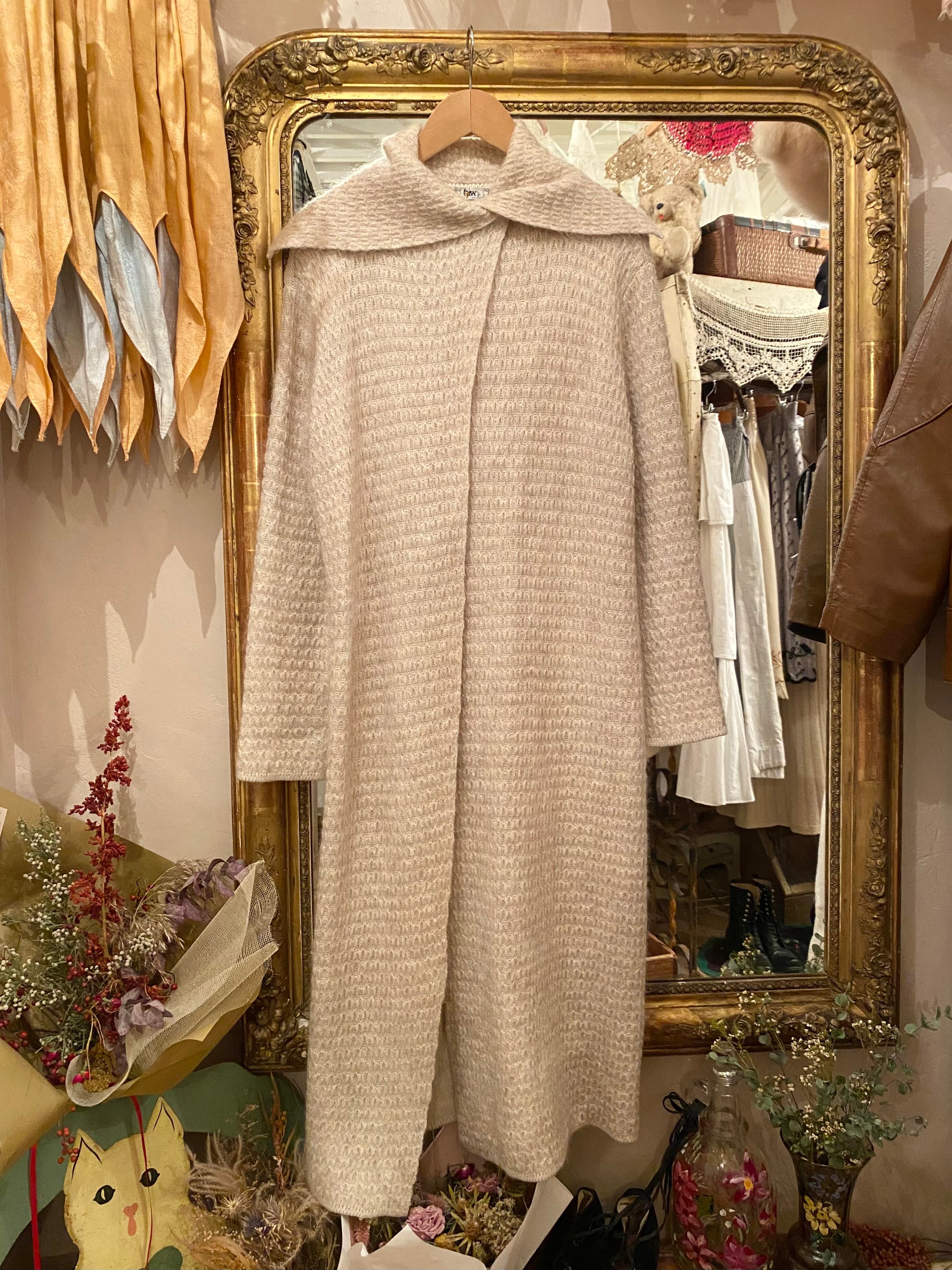 モヘア混紡のふわふわとした肌触りが心地よく、ロング丈で足元までしっかりと防寒ができます♡首元に1つついたボタンで着脱ができ、ベルトでウエストマークして着るのもかわいいかと思います♡
