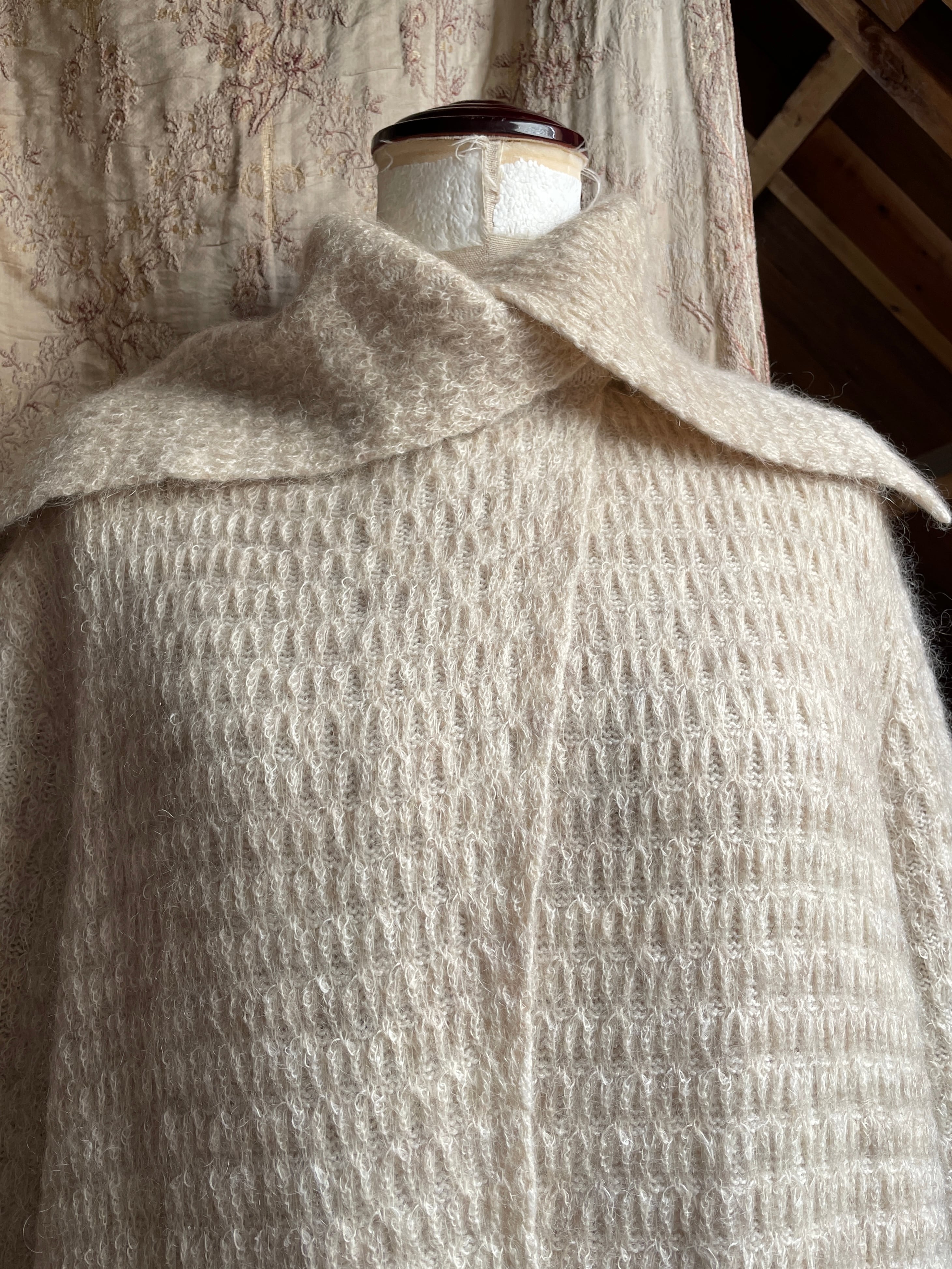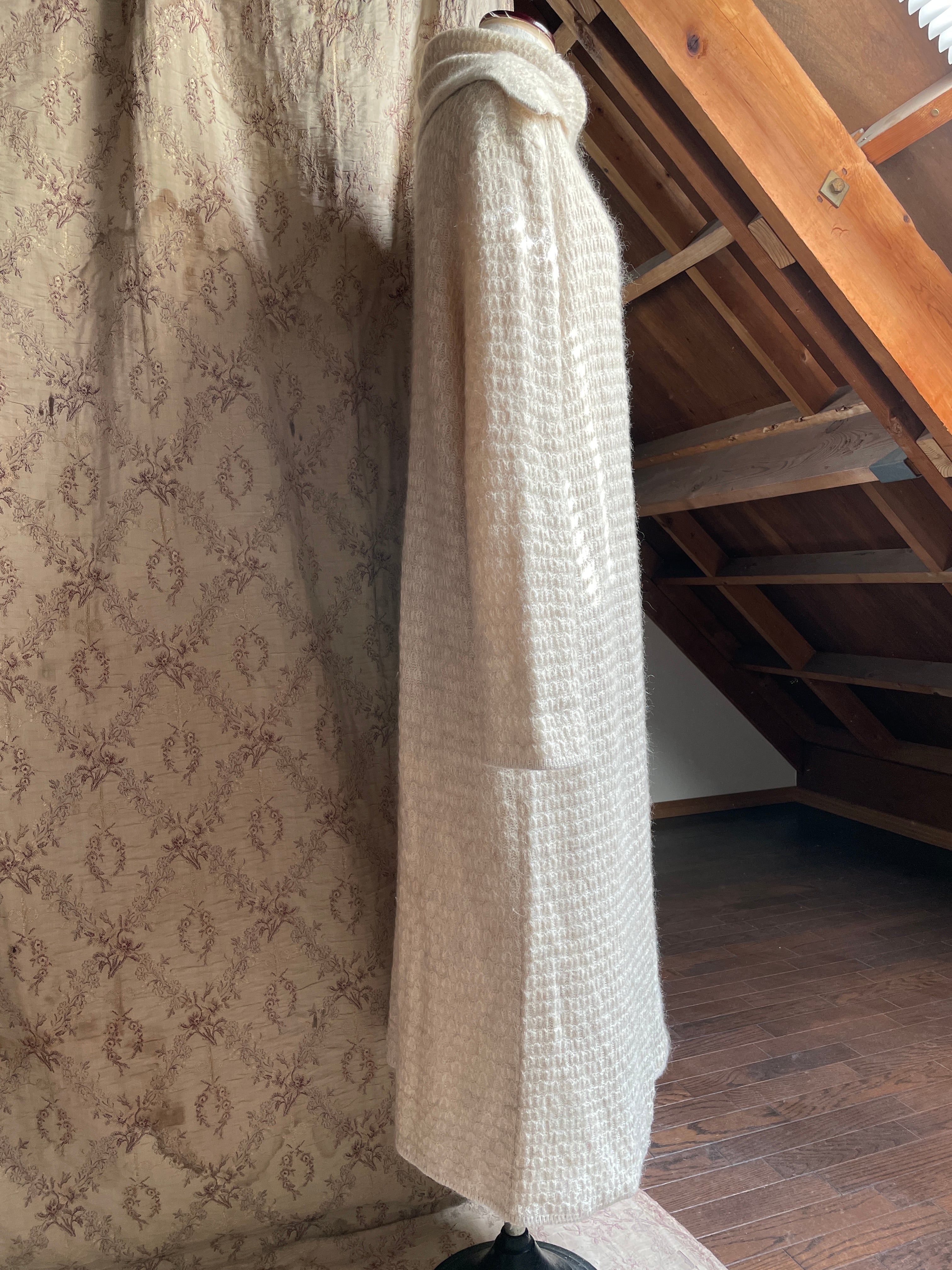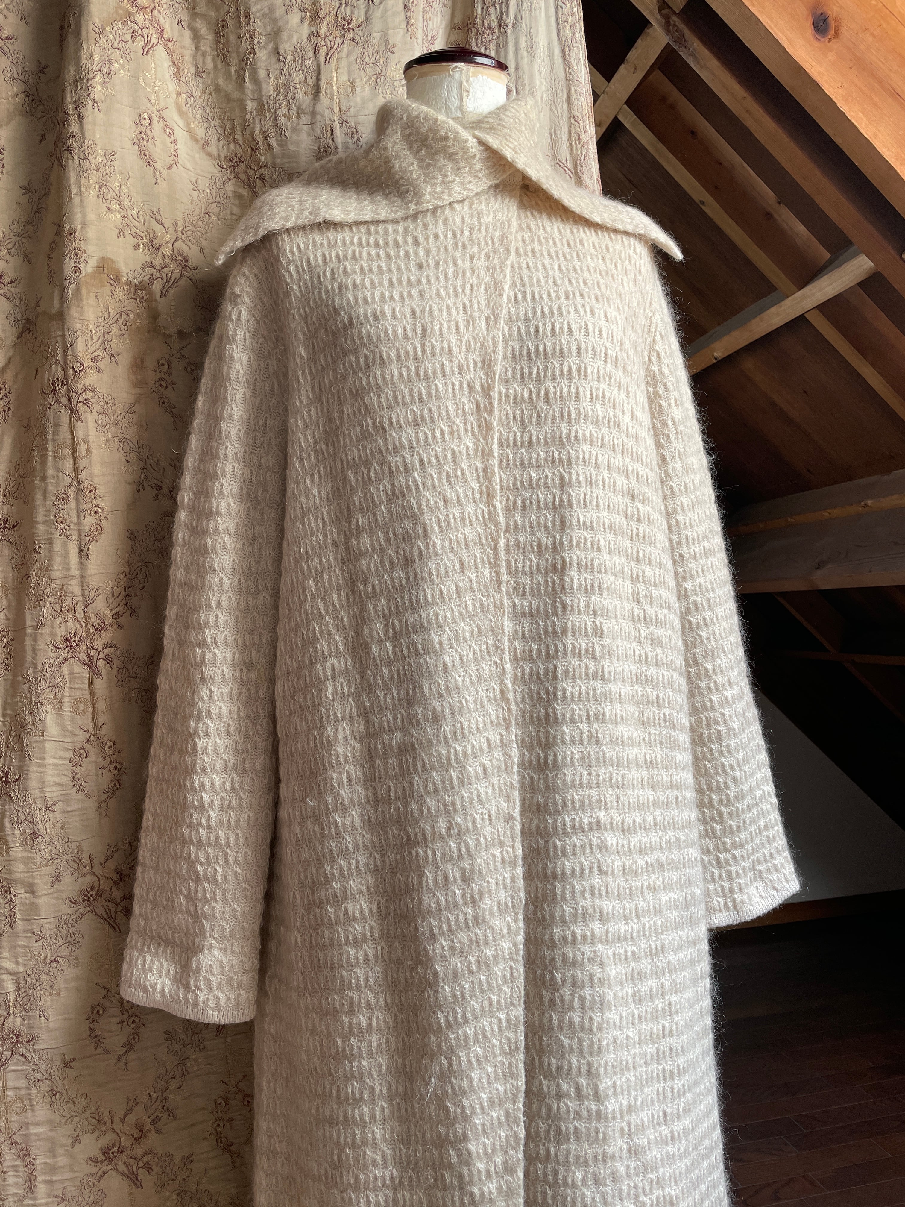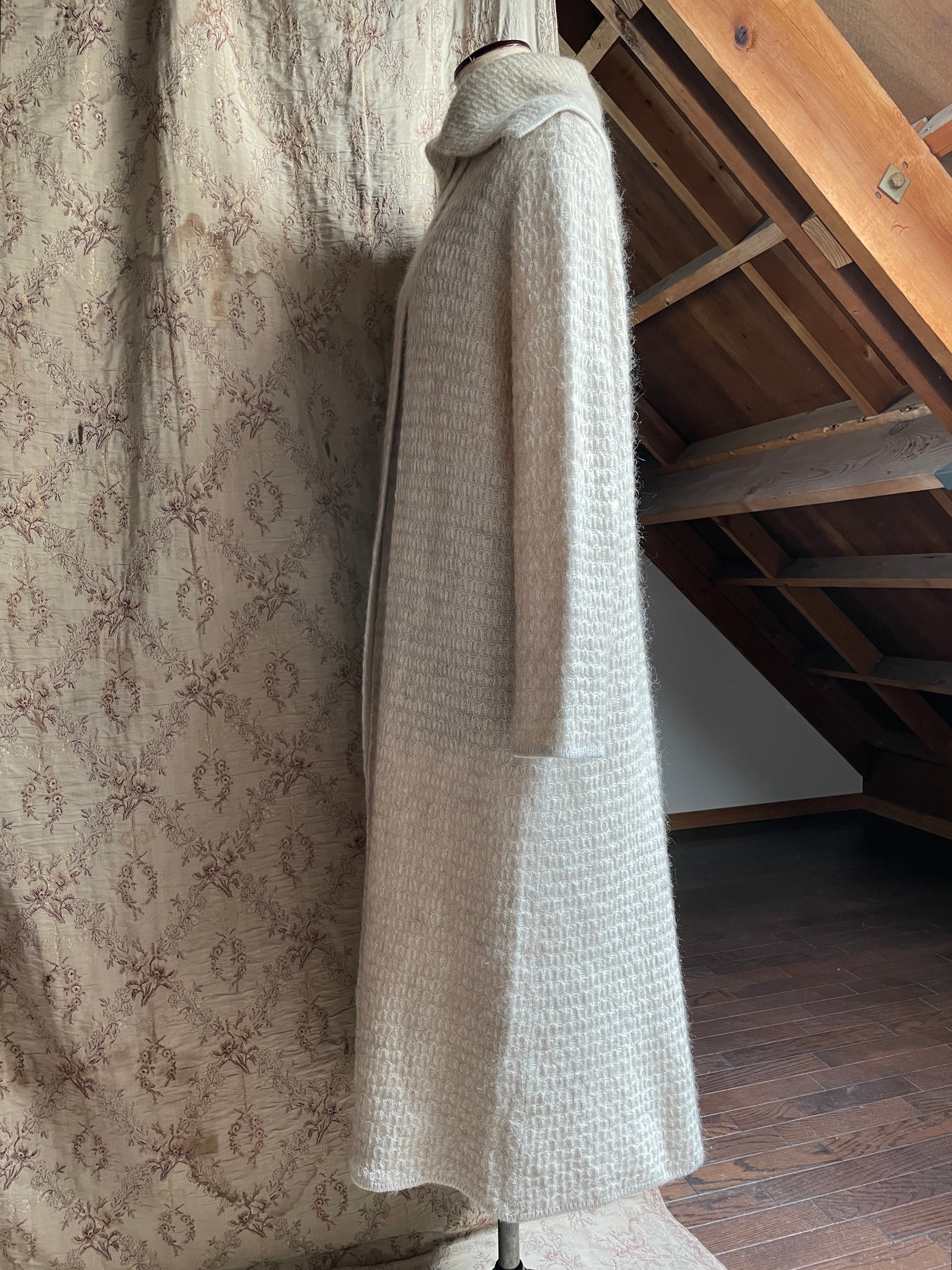 モヘア混紡のふわふわとした肌触りが心地よく、ロング丈で足元までしっかりと防寒ができます♡首元に1つついたボタンで着脱ができ、ベルトでウエストマークして着るのもかわいいかと思います♡