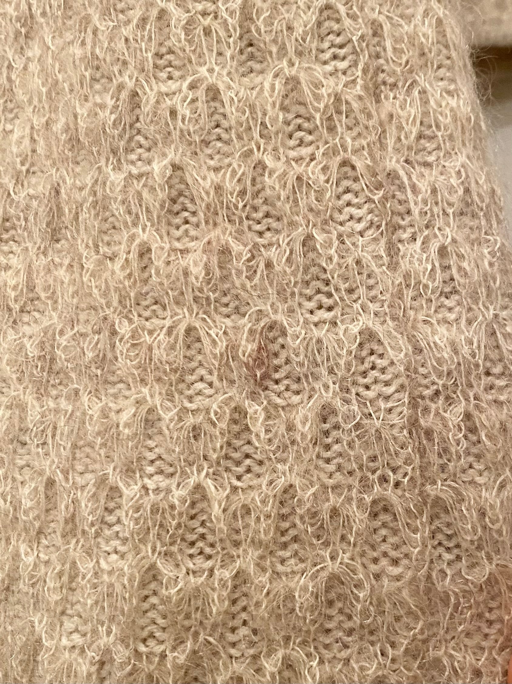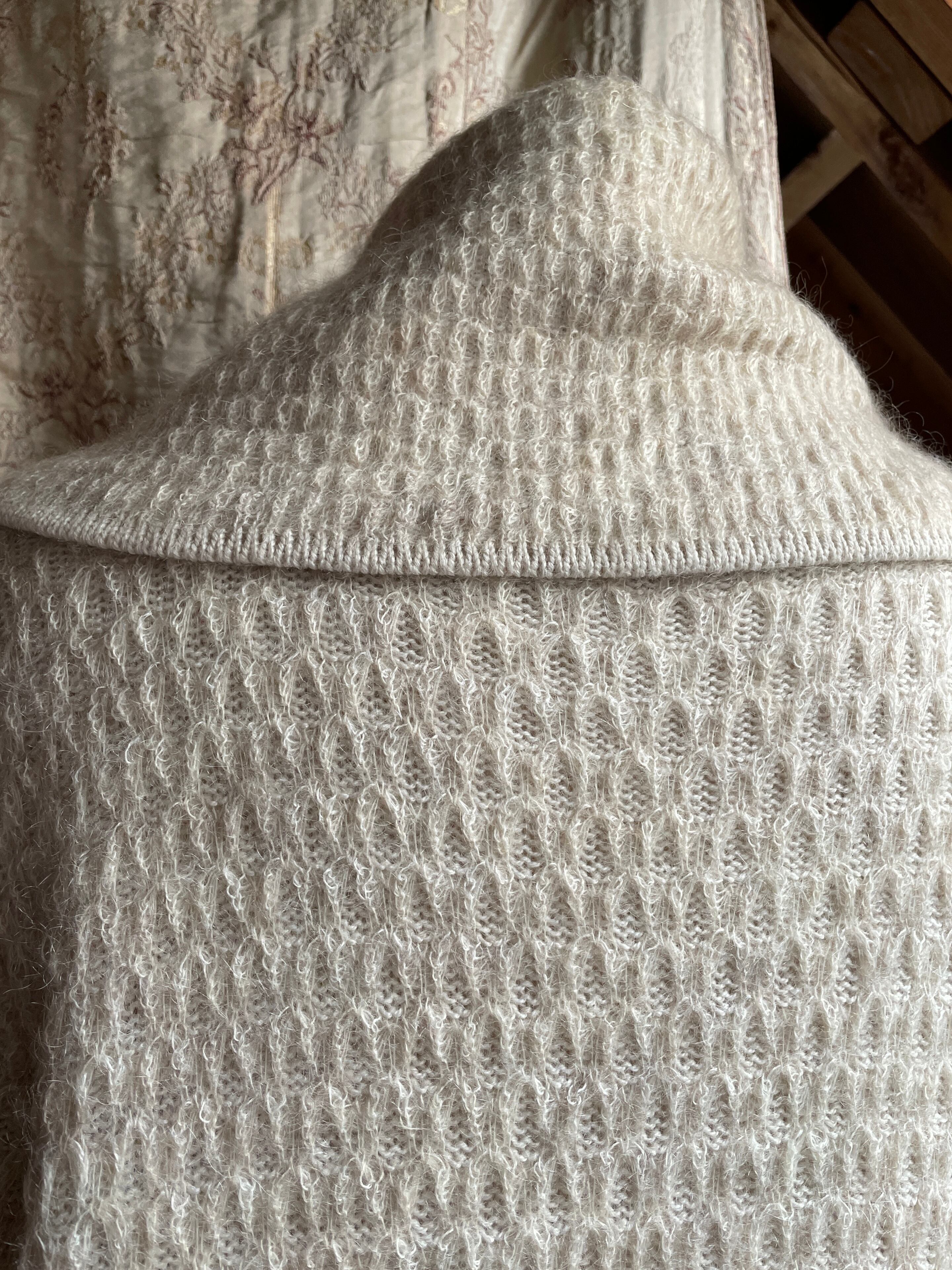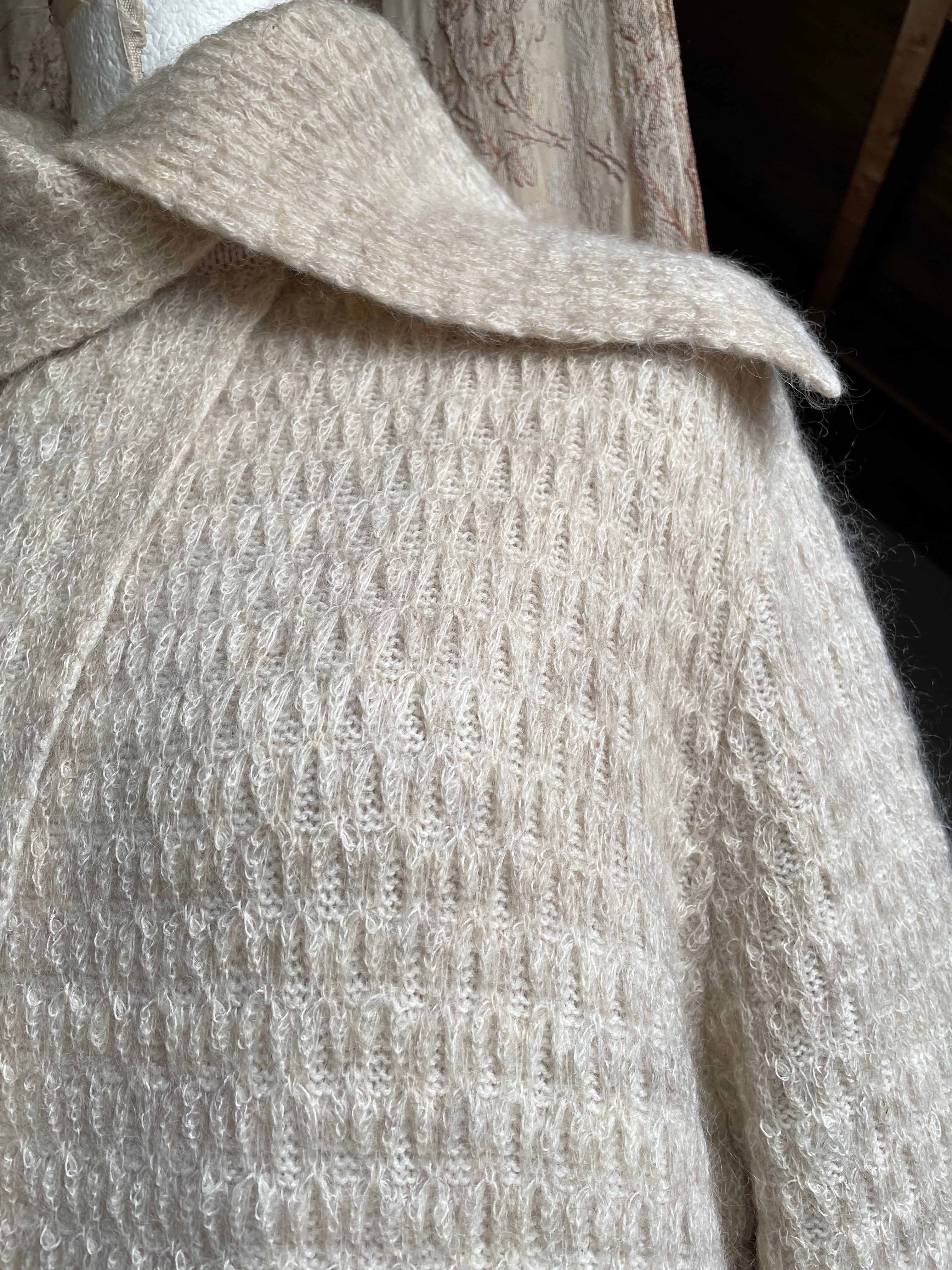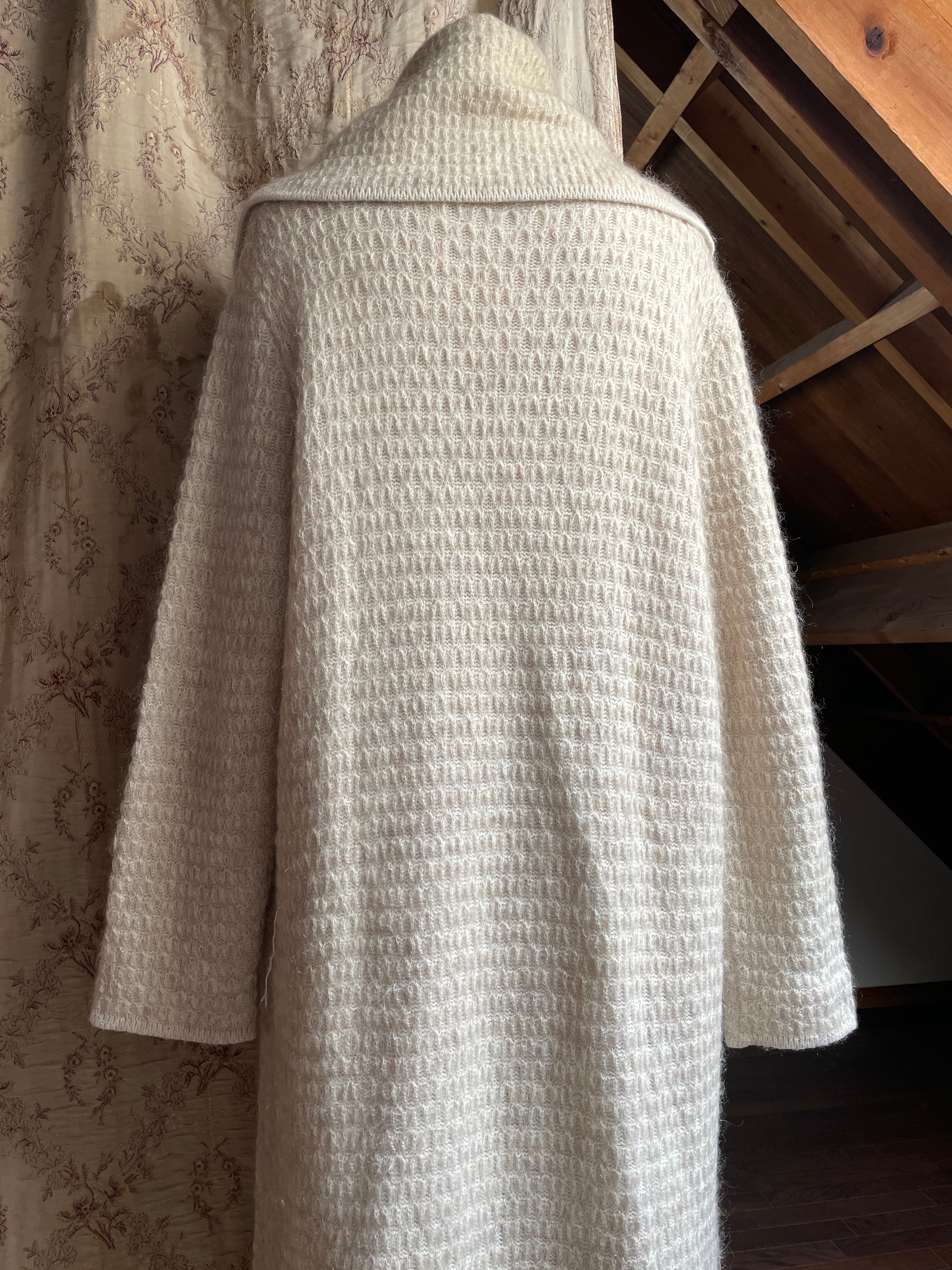 モヘア混紡のふわふわとした肌触りが心地よく、ロング丈で足元までしっかりと防寒ができます♡首元に1つついたボタンで着脱ができ、ベルトでウエストマークして着るのもかわいいかと思います♡