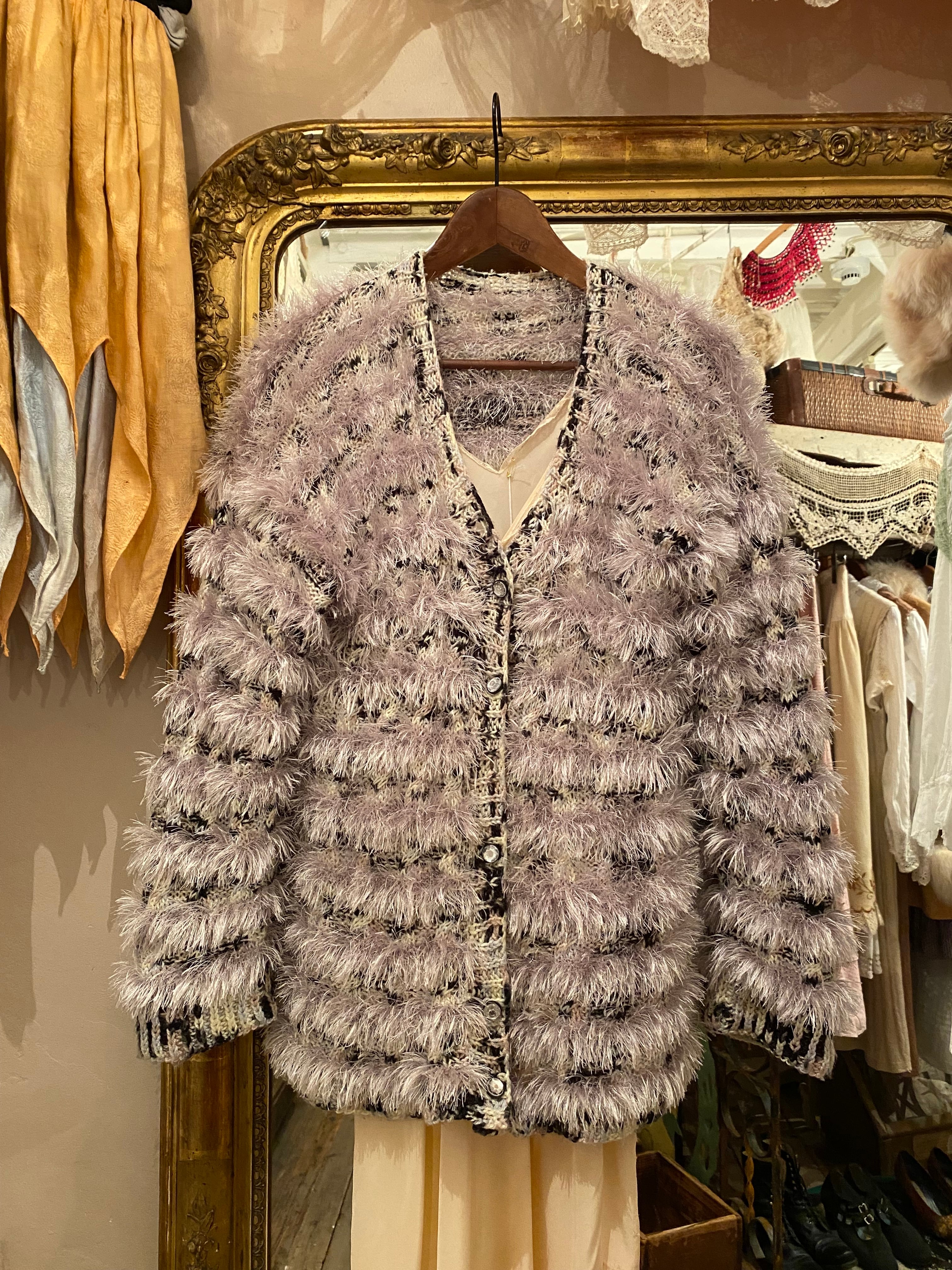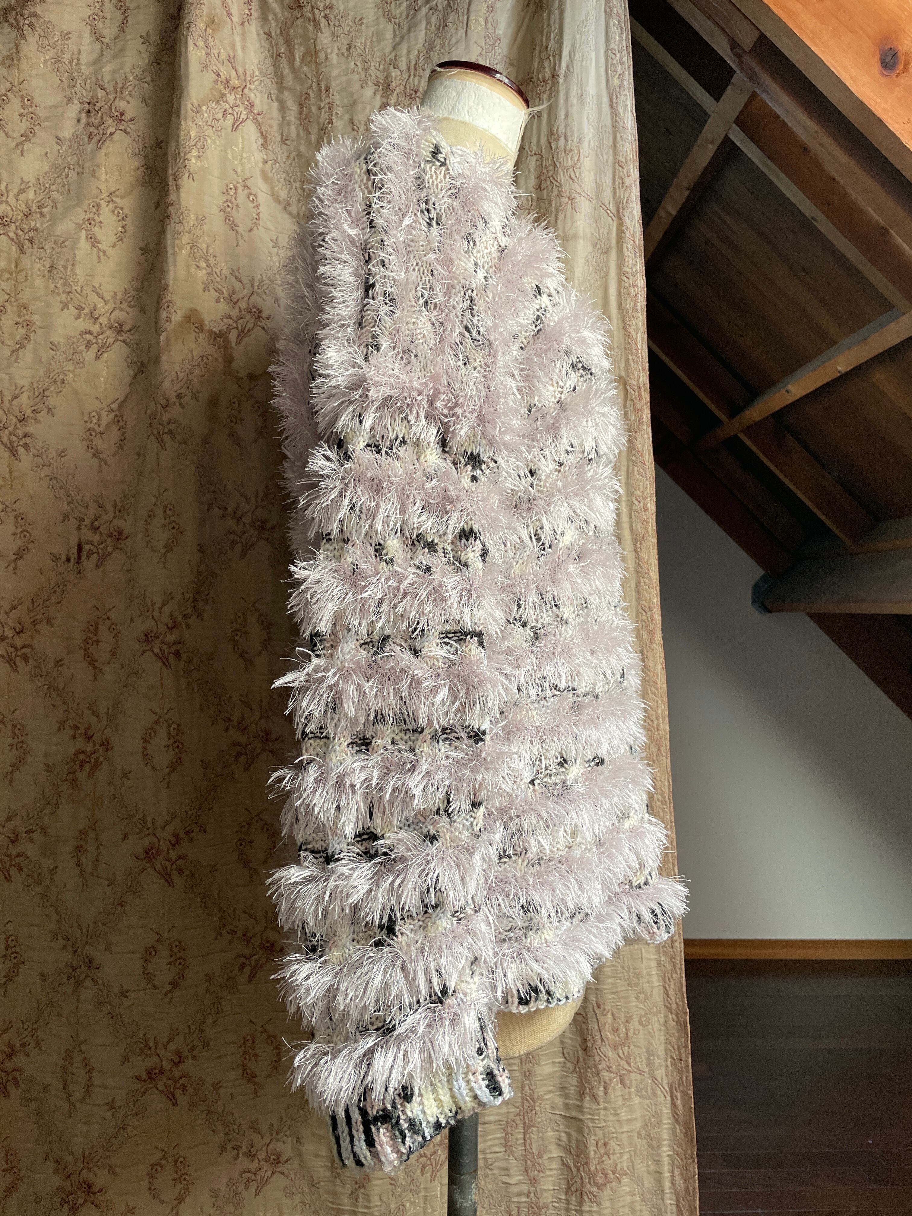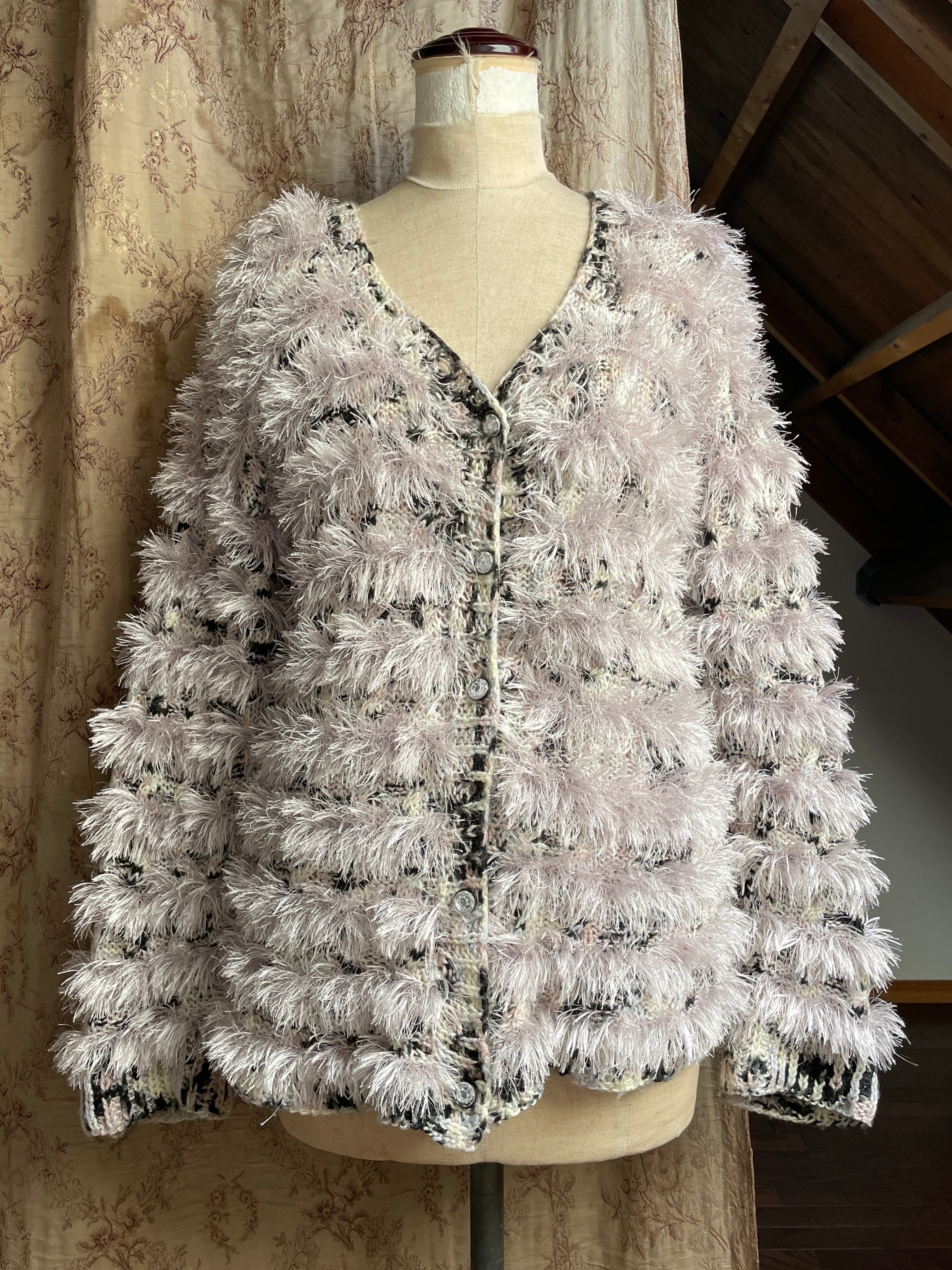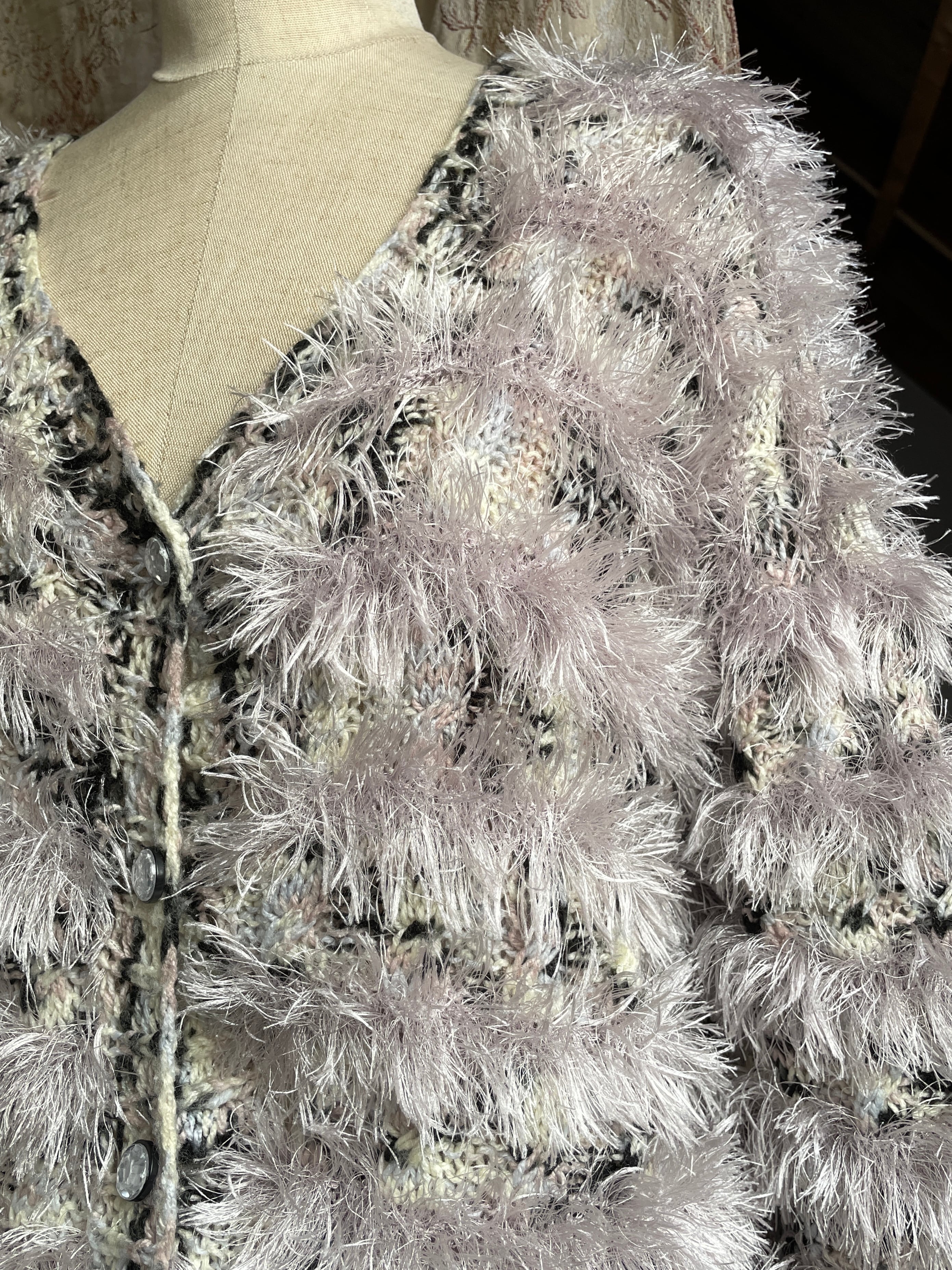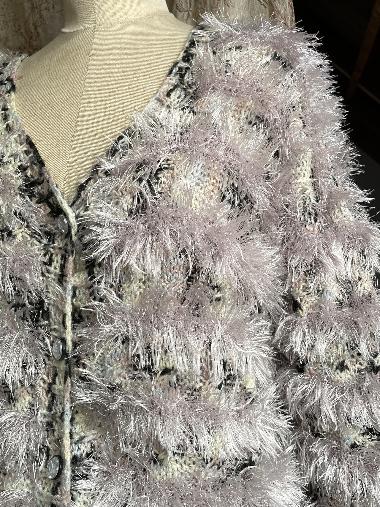 パステルカラーなお色×黒色ミックスな毛糸で編まれており、その上にうすラベンダー色のフリンジがふわふわと装飾された、コットンキャンディのような色合いのカーディガン♡