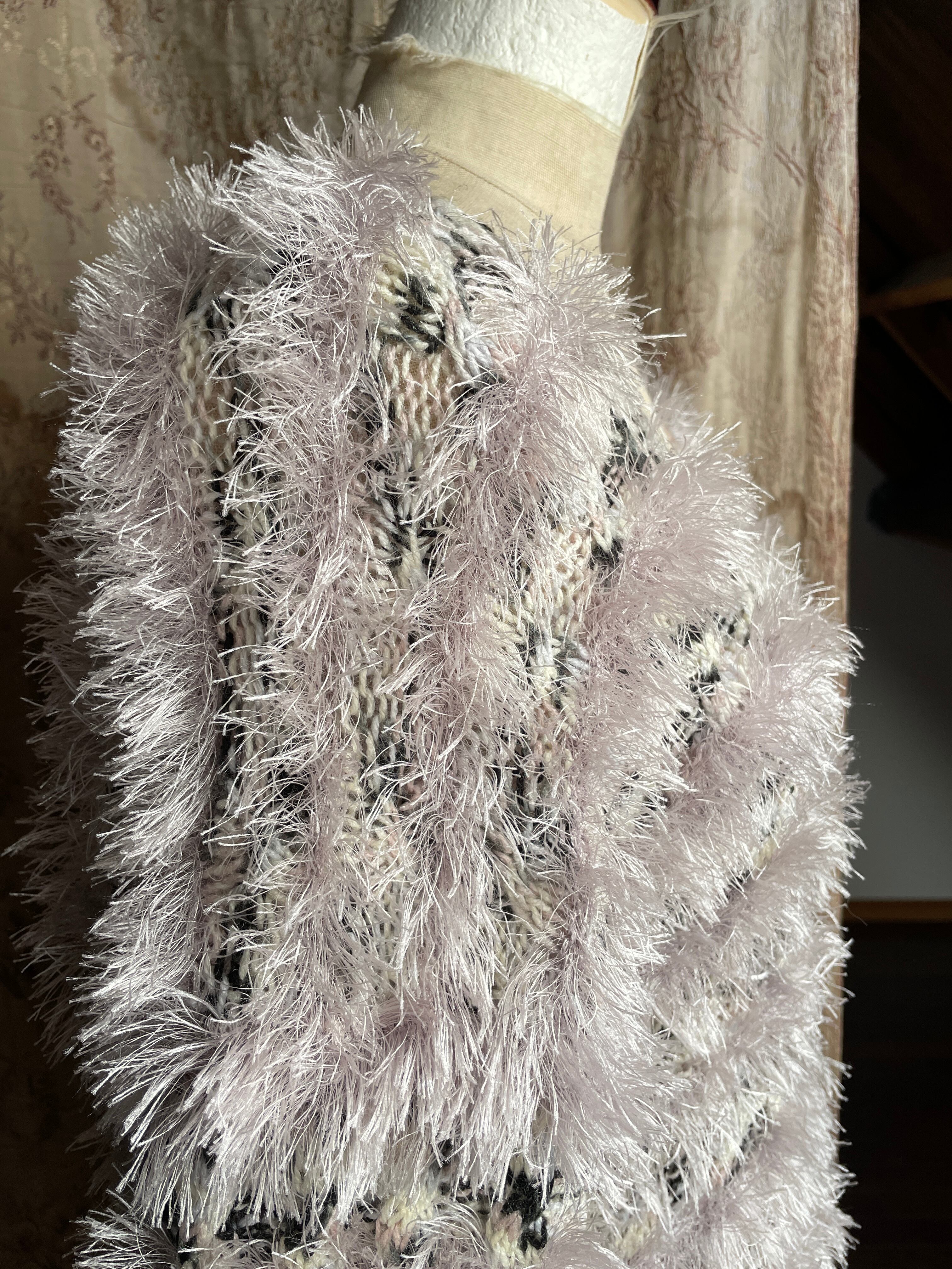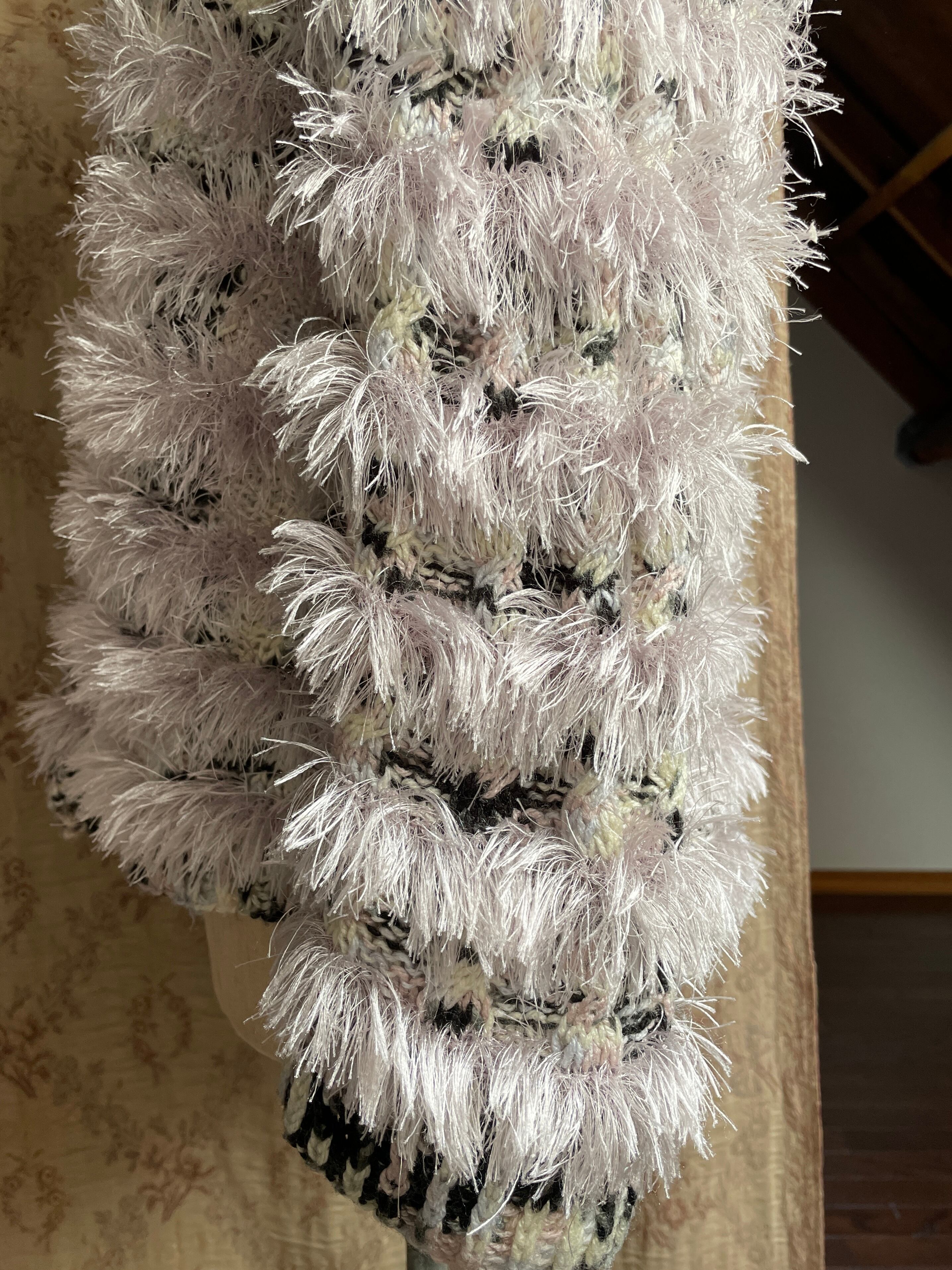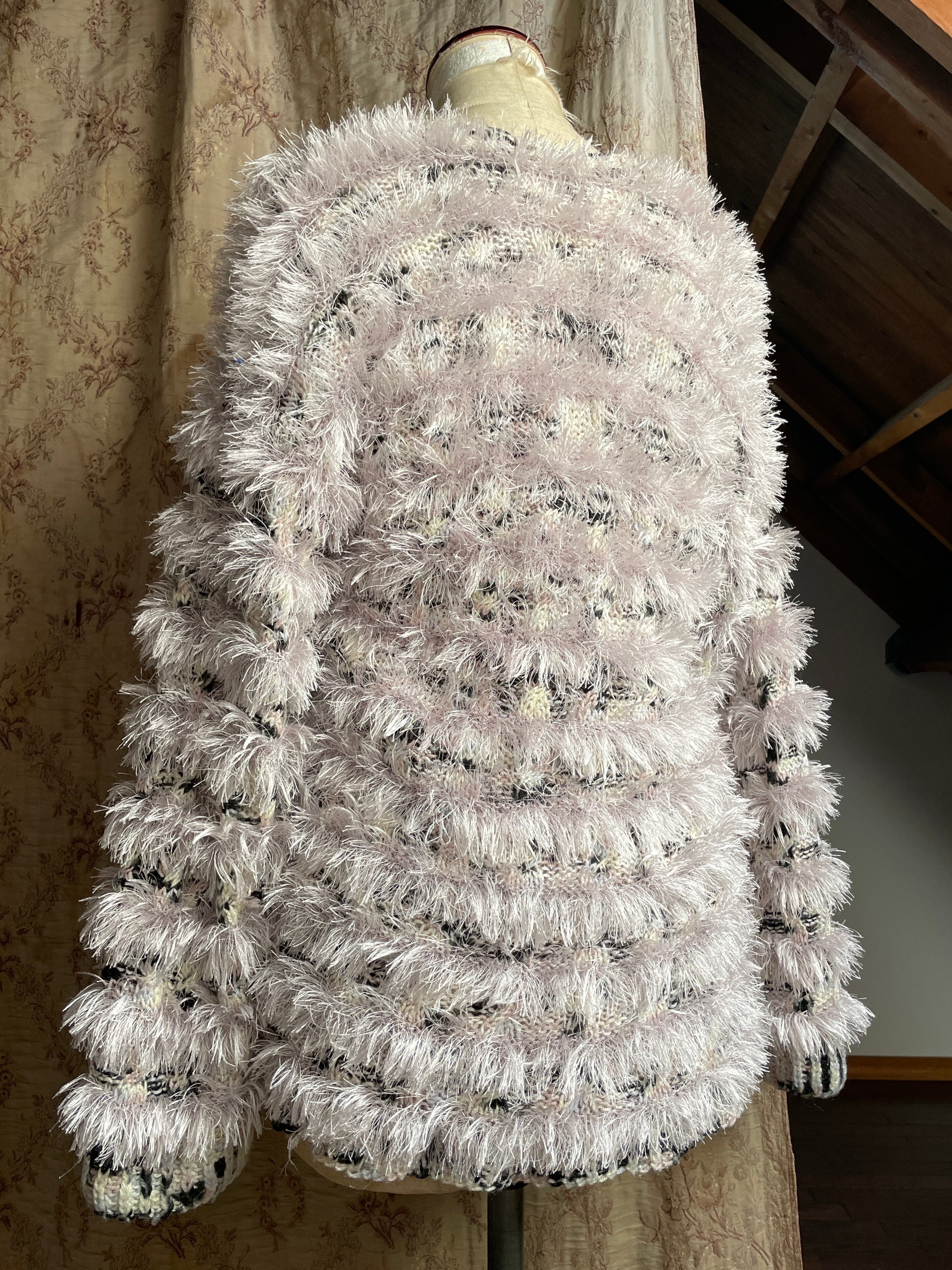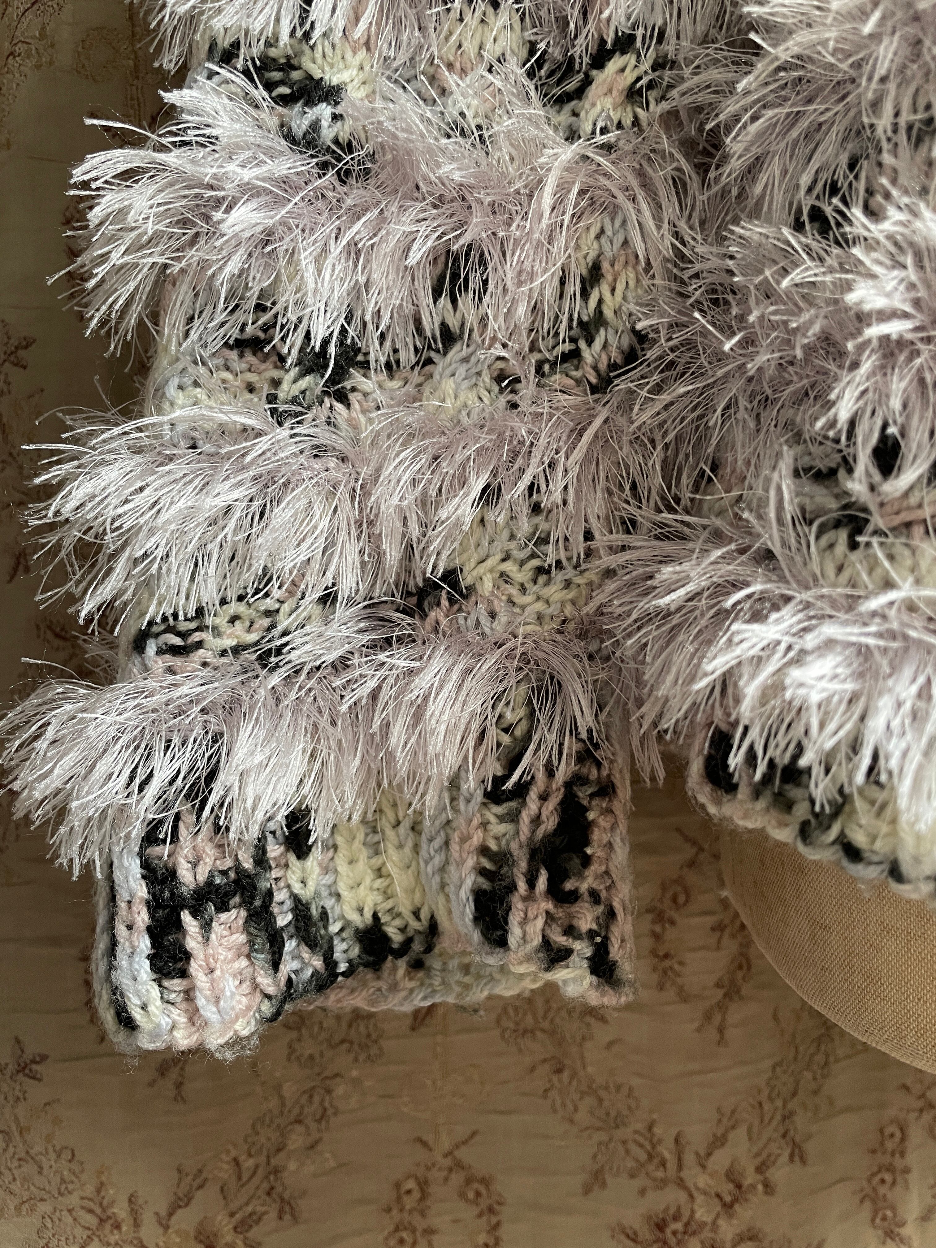 パステルカラーなお色×黒色ミックスな毛糸で編まれており、その上にうすラベンダー色のフリンジがふわふわと装飾された、コットンキャンディのような色合いのカーディガン♡
