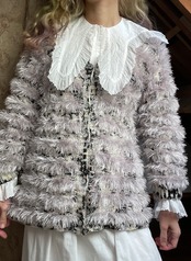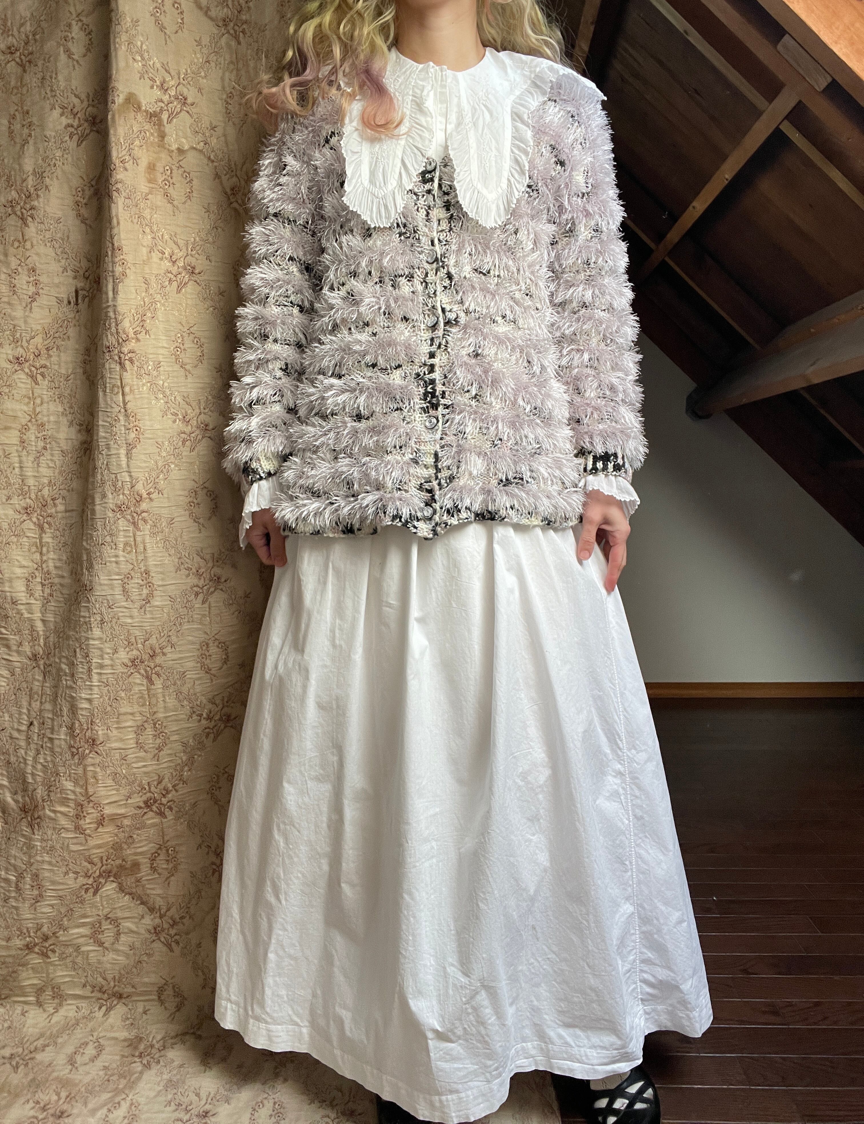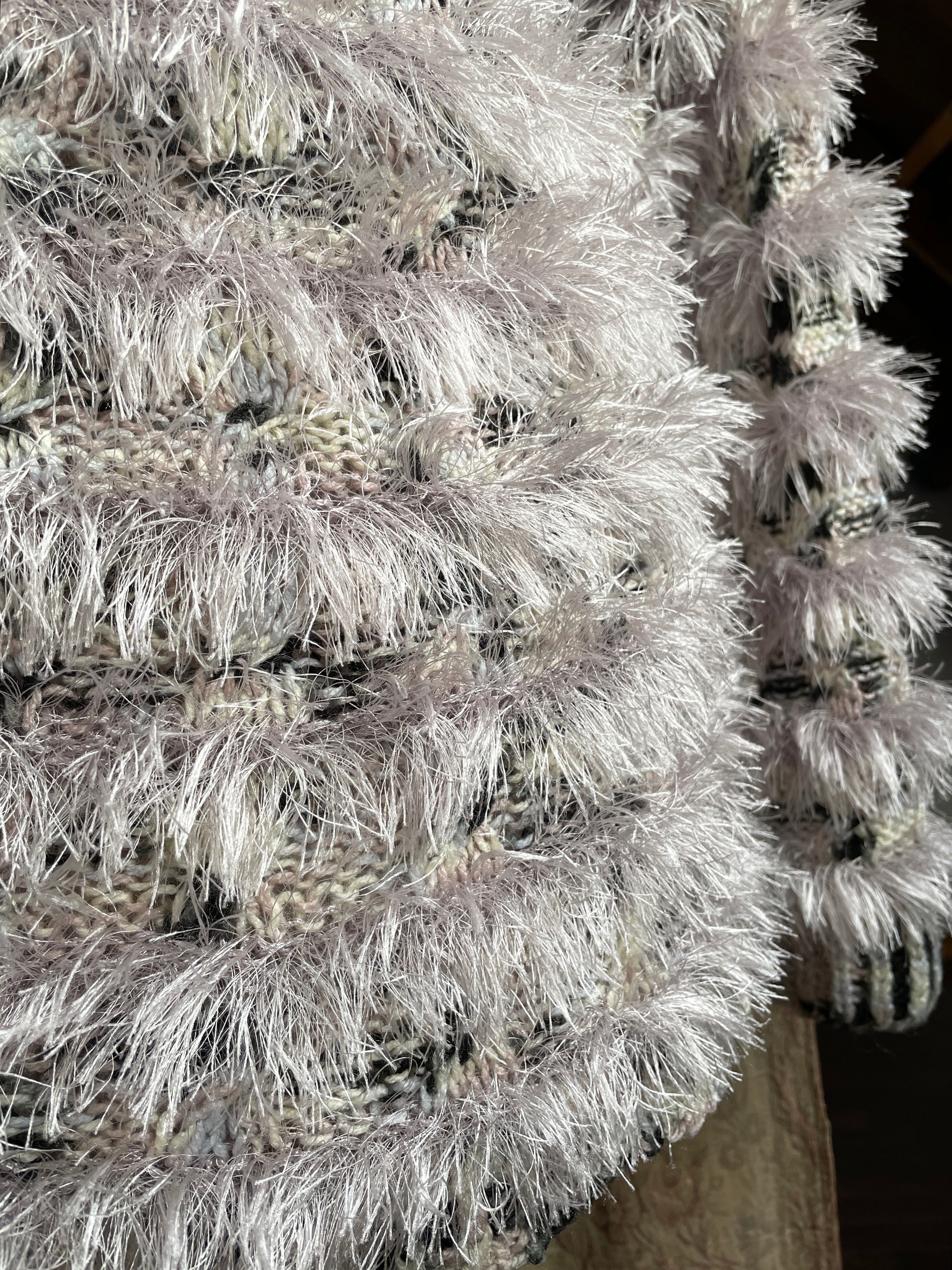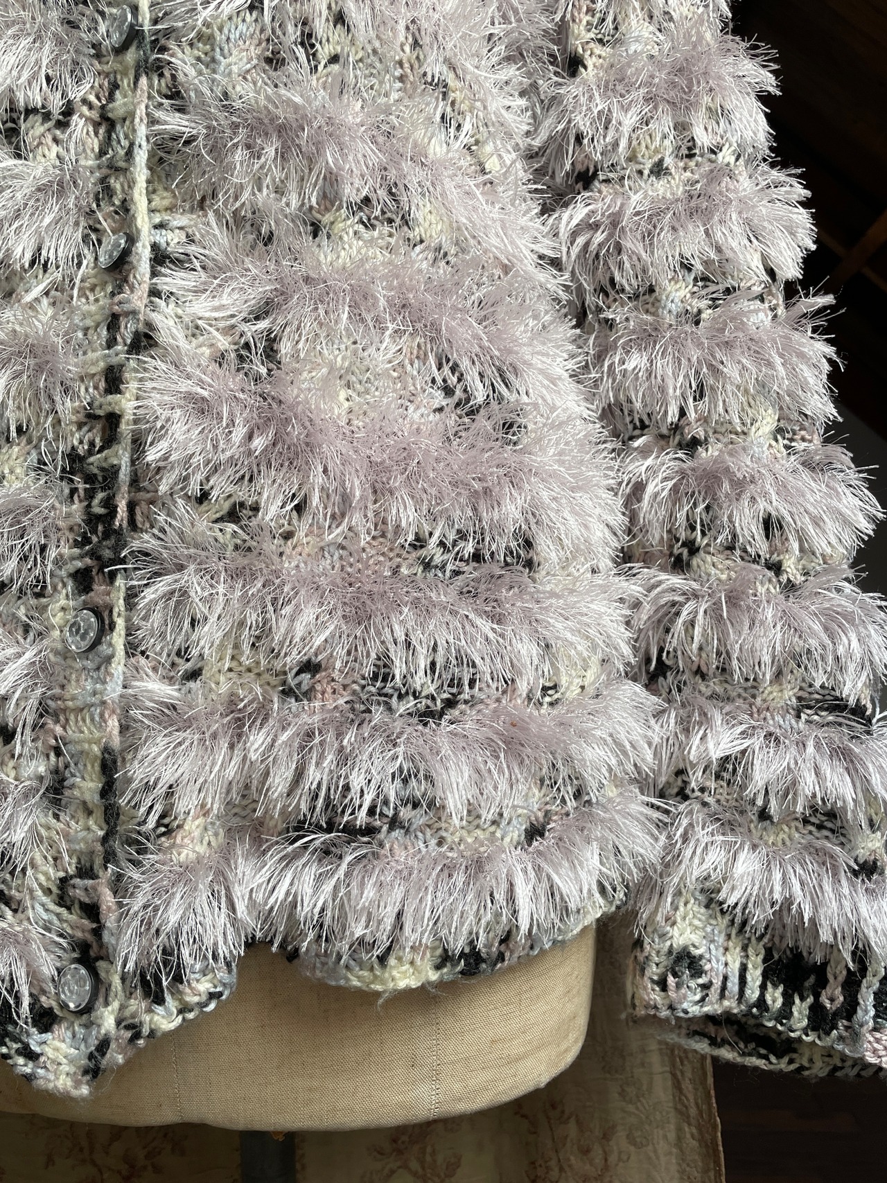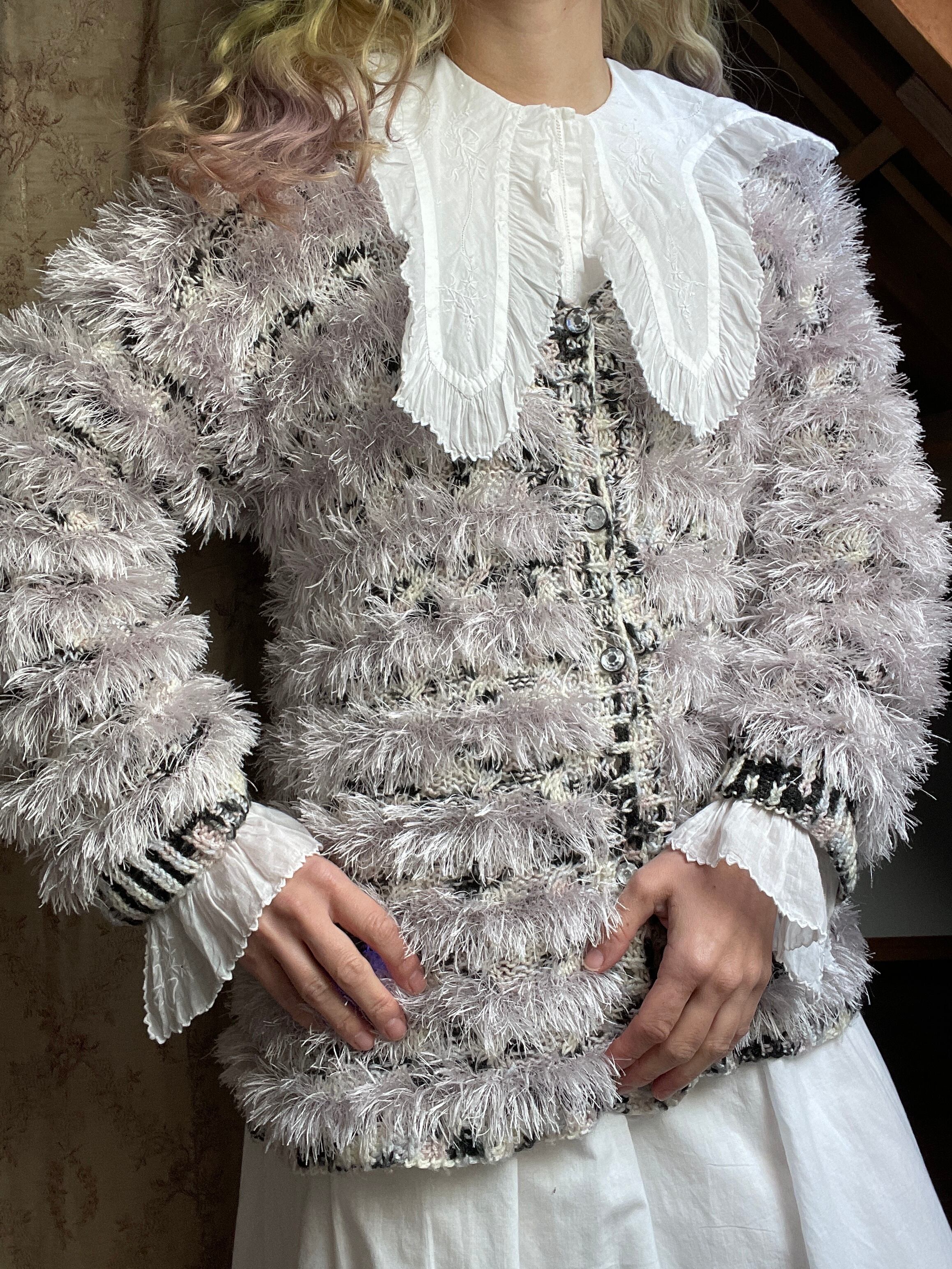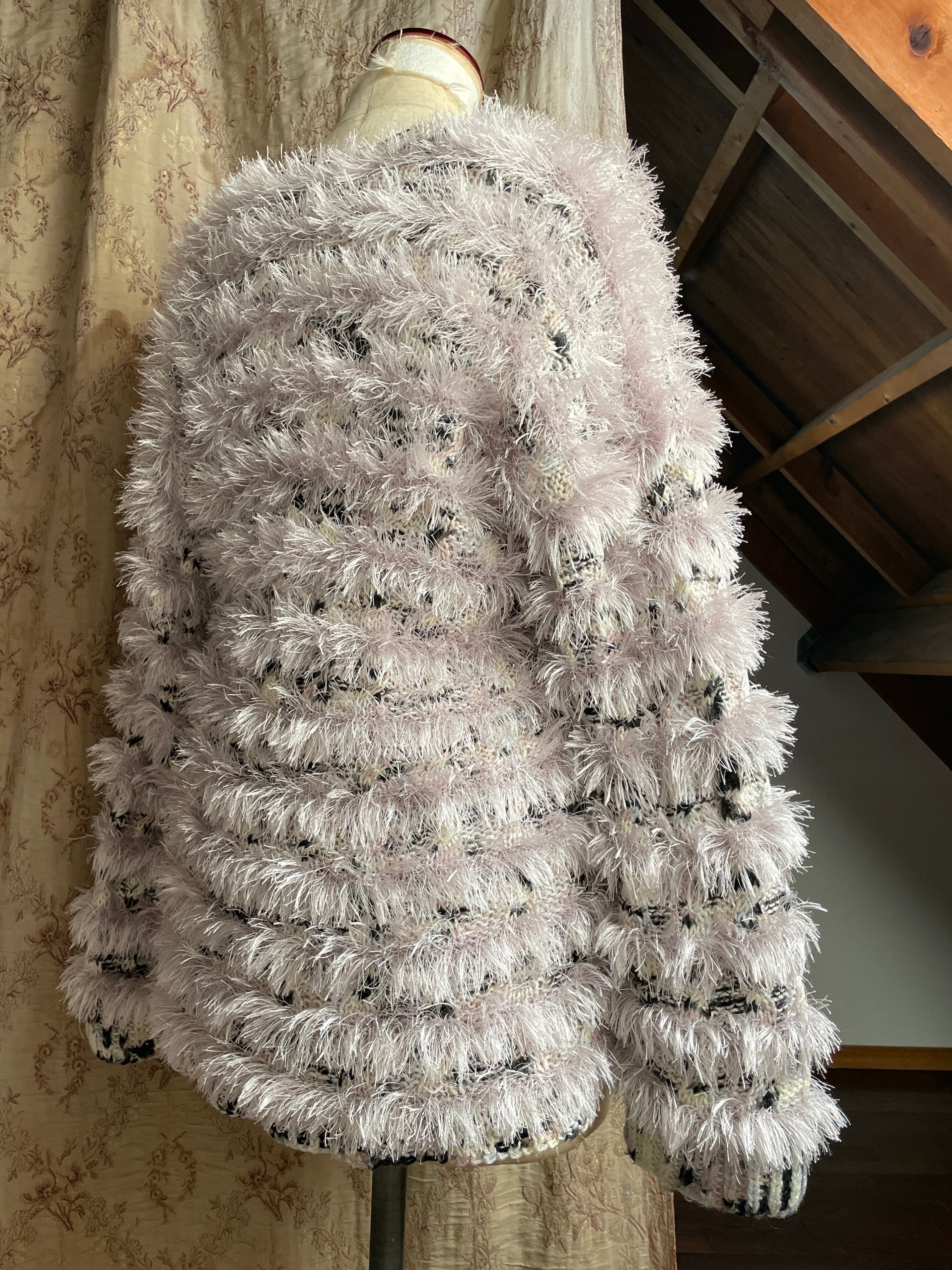 パステルカラーなお色×黒色ミックスな毛糸で編まれており、その上にうすラベンダー色のフリンジがふわふわと装飾された、コットンキャンディのような色合いのカーディガン♡