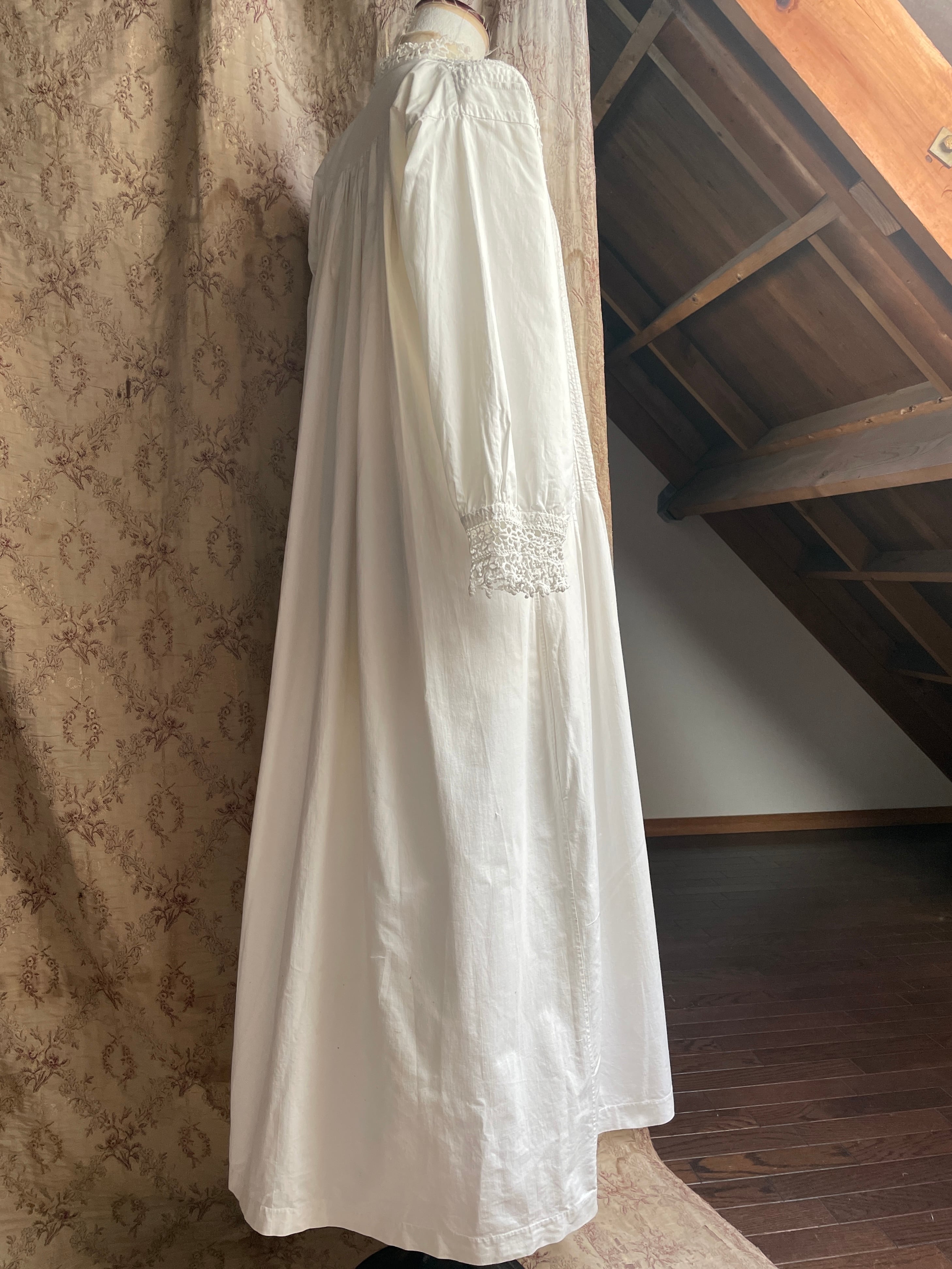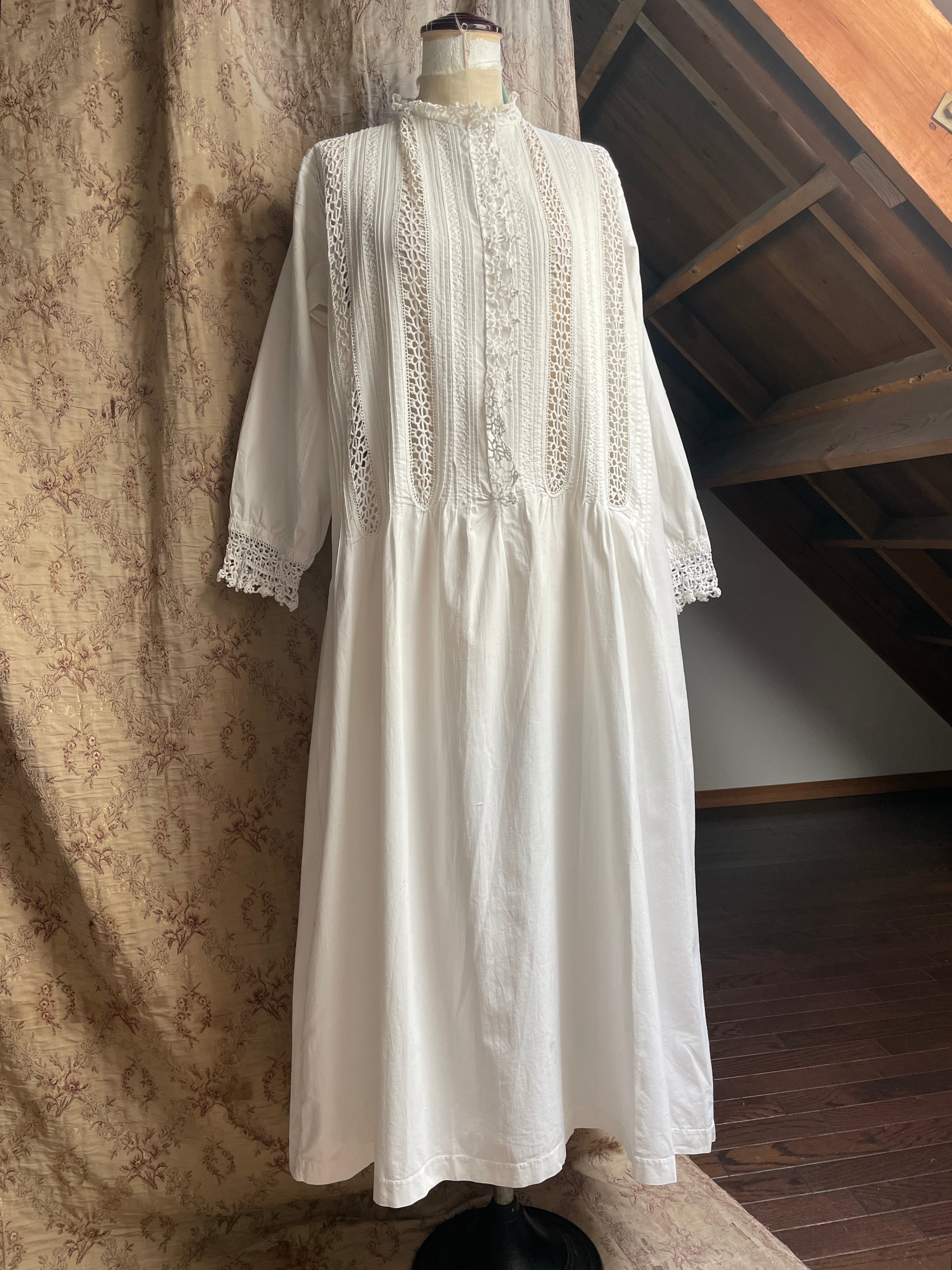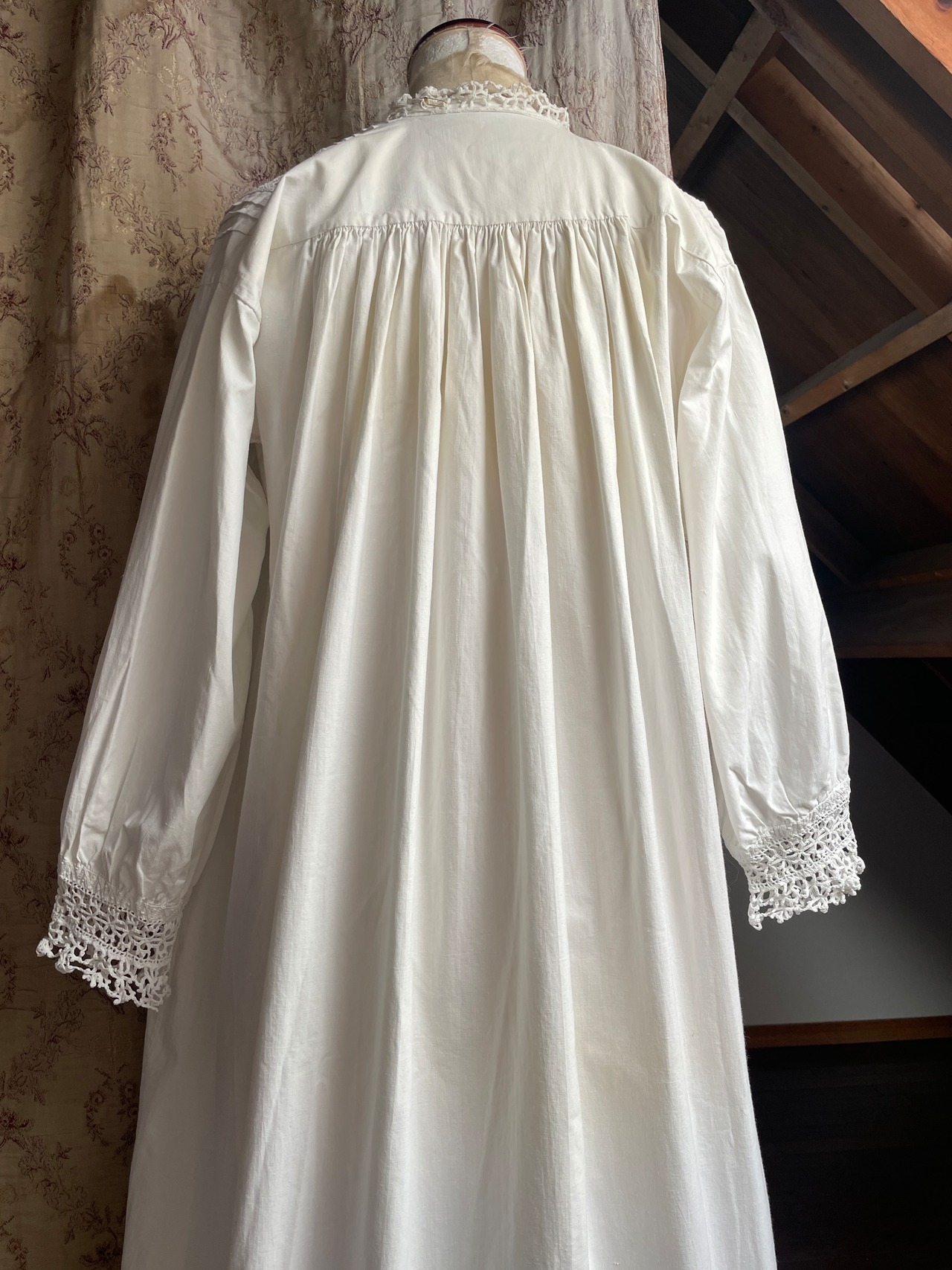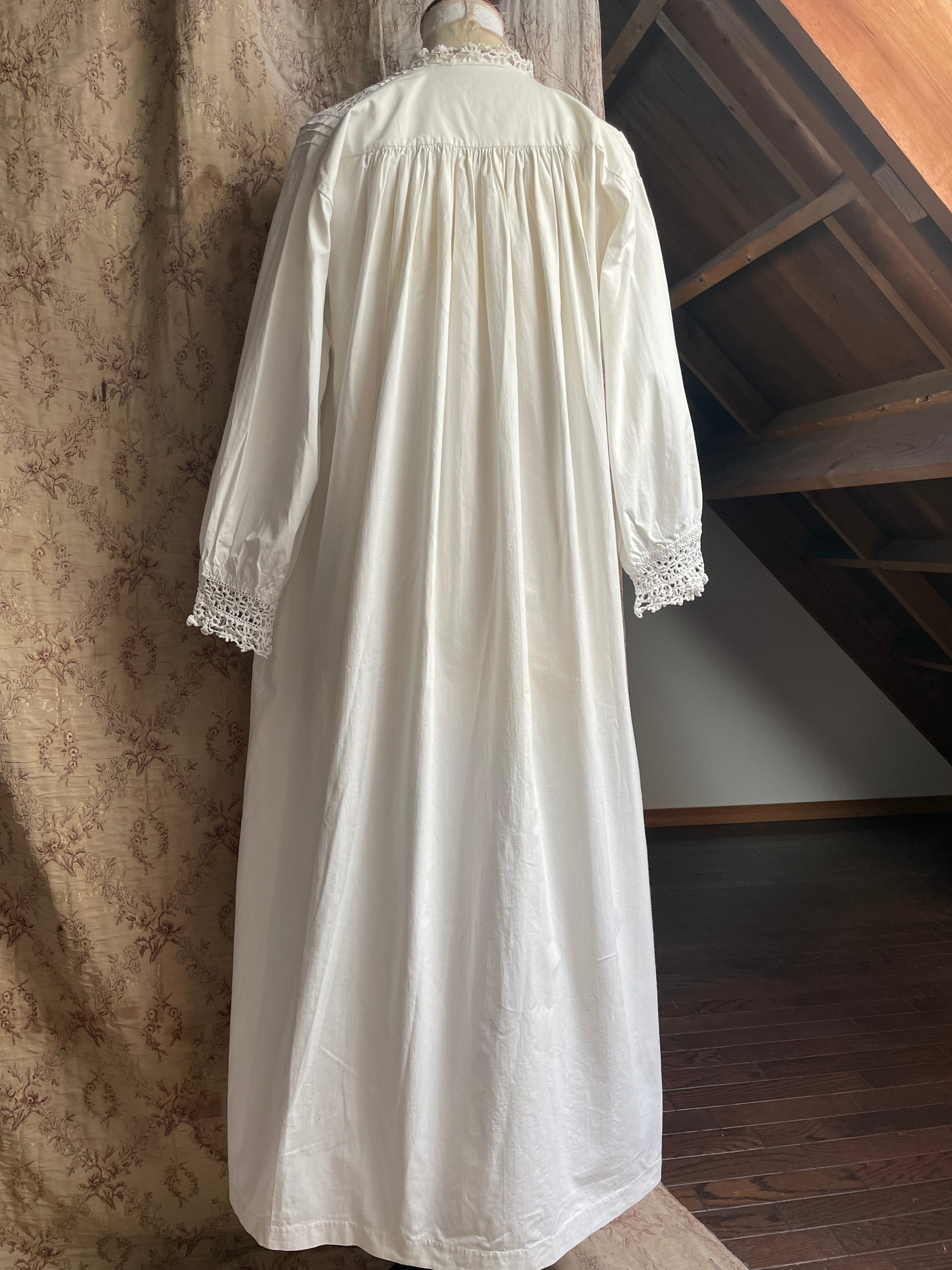 生地はとてもしっかりとしたコットンで、着用時も張りが出るタイプ、当店で扱うナイトドレスの中でも比較的マキシ丈すぎないので、