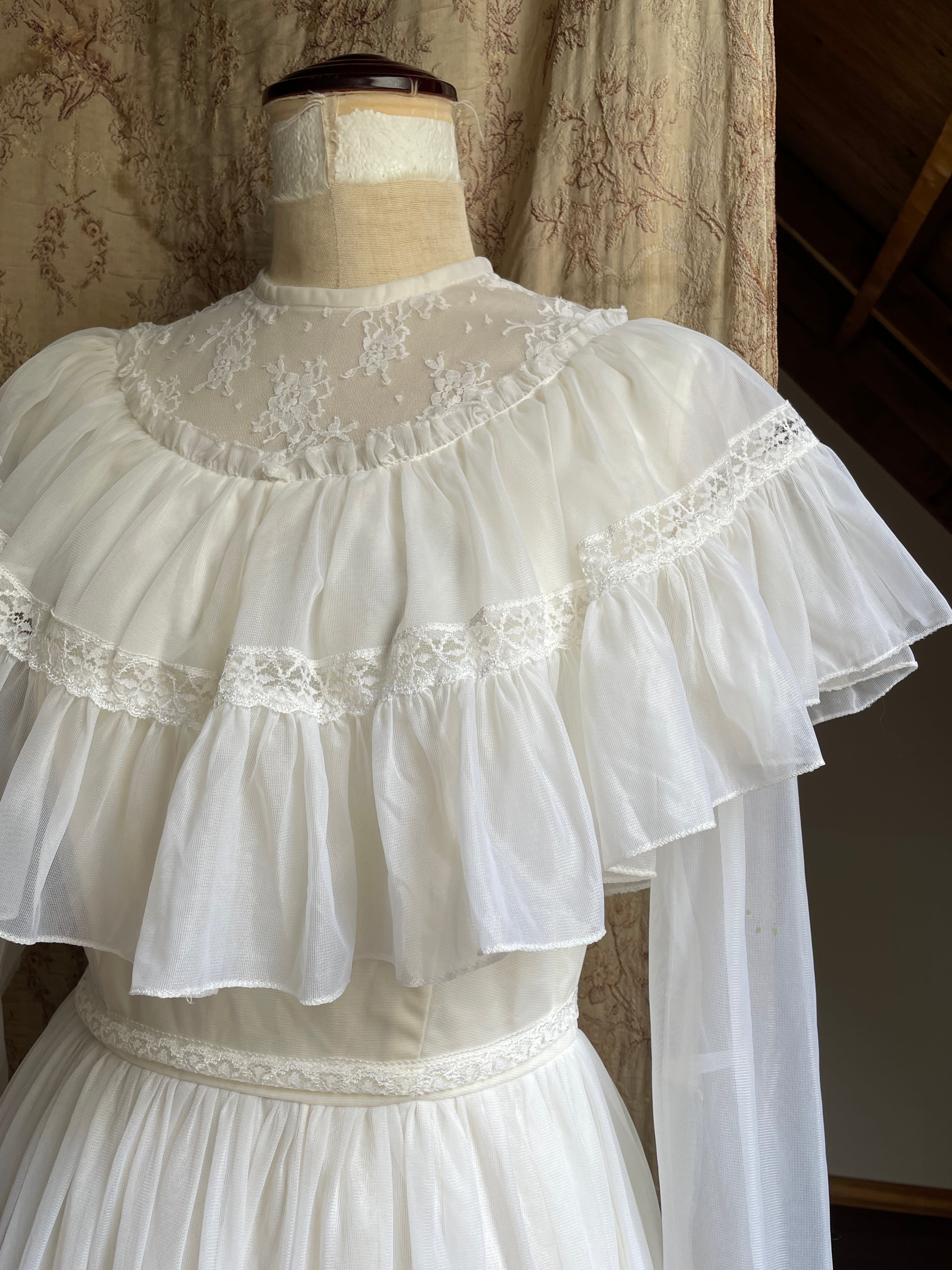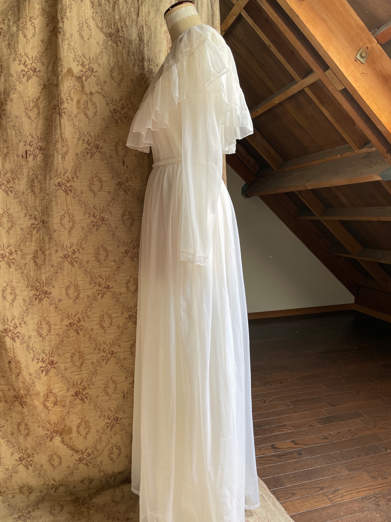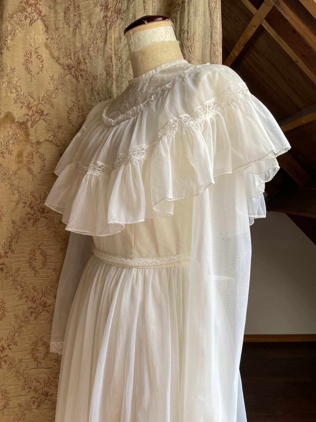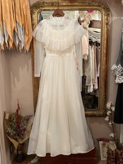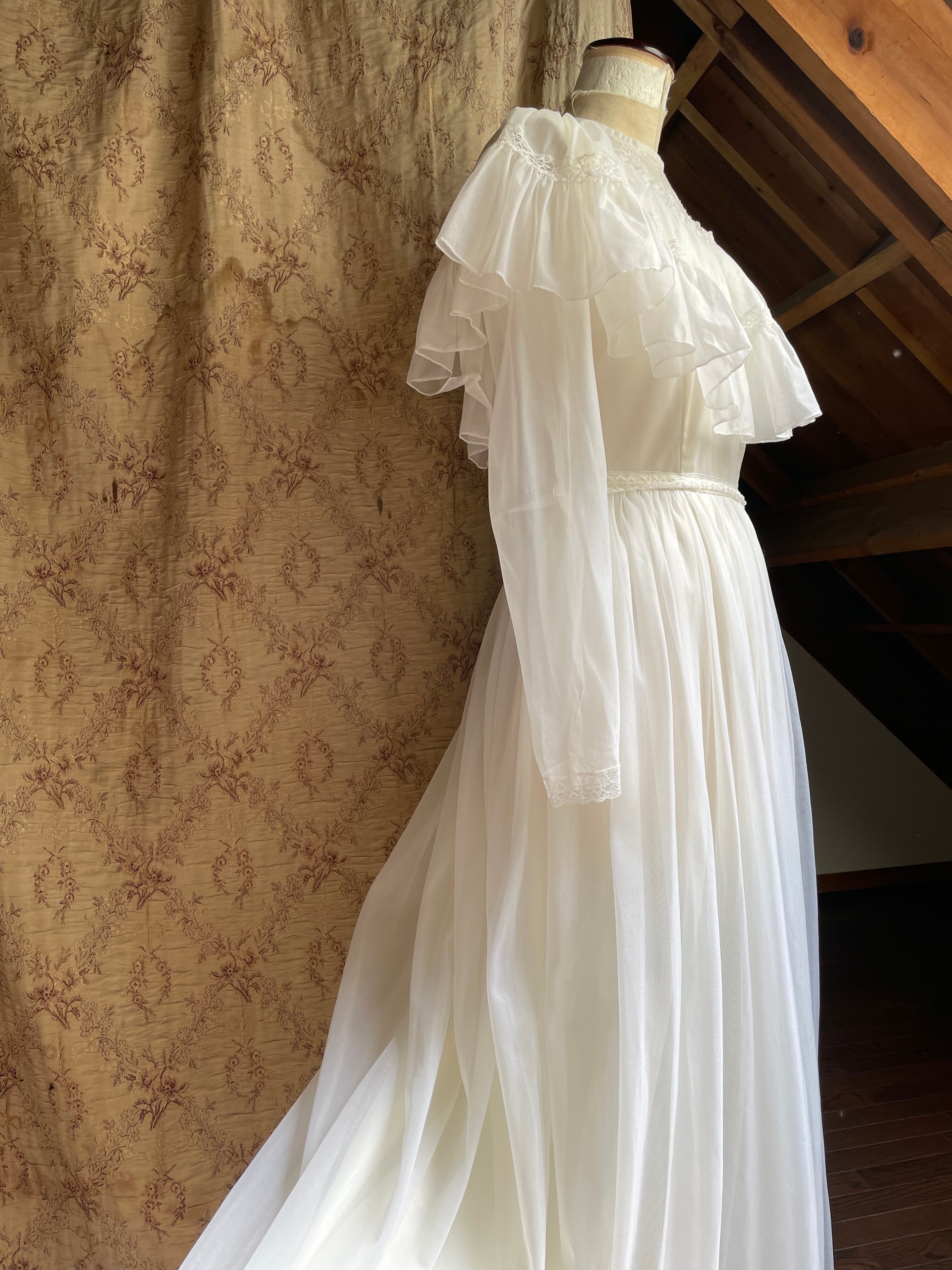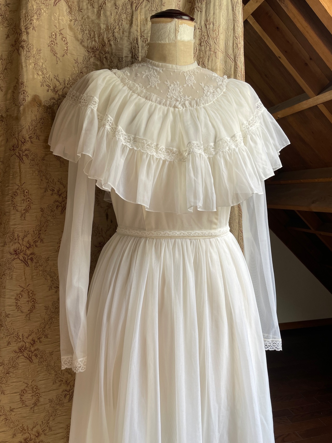 おそらく70年代頃のvintageかと思われます♡ミルキーホワイトなお色にほわほわなシアー感お胸のレースやフリルなど、お姫様のドレスのようなロマンティックなデザインです♡
