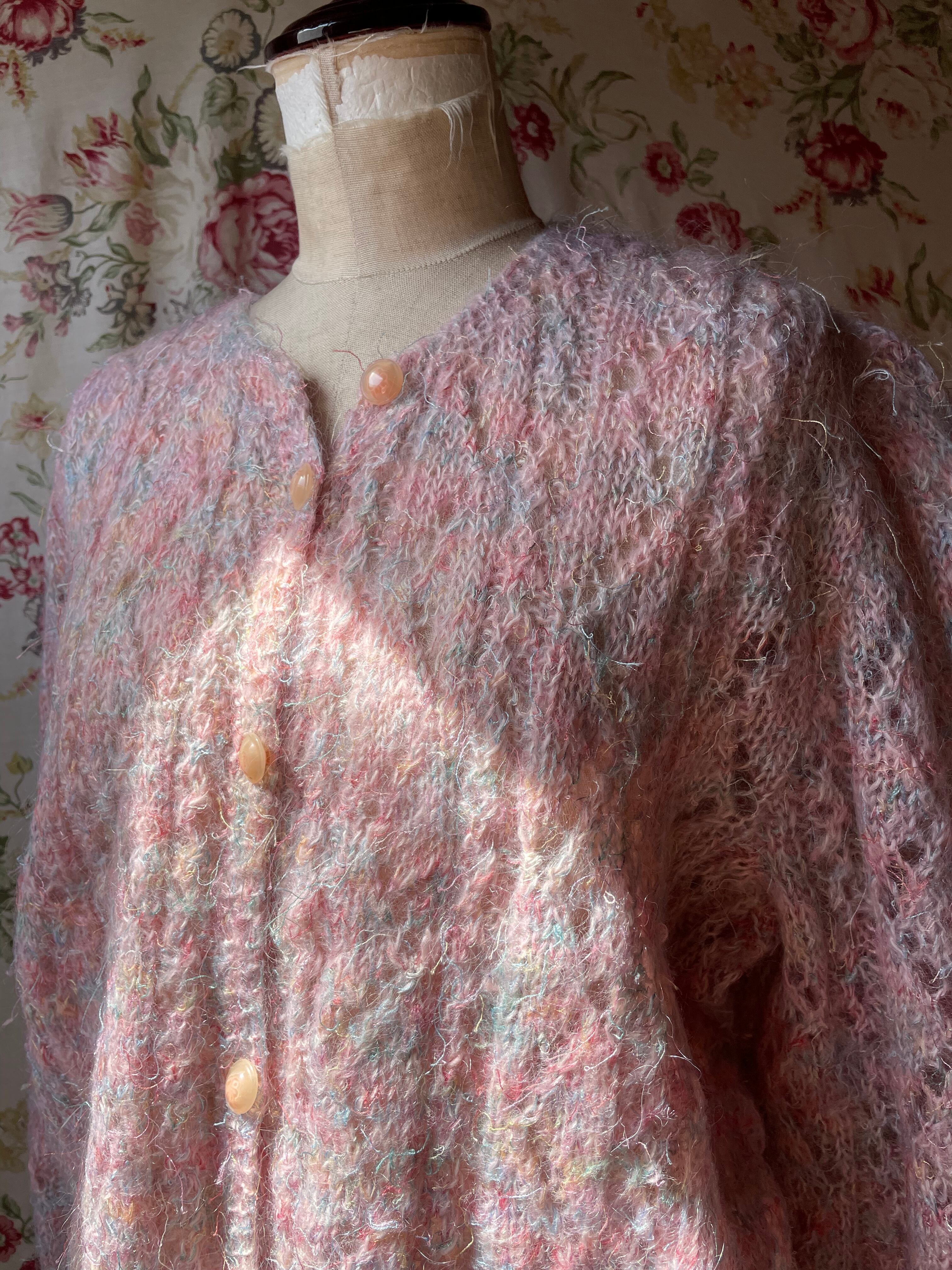 パステルカラーの糸がたくさん織り込まれた毛糸を使って編まれており、ボタンまでキャンディのようなお色味です♡