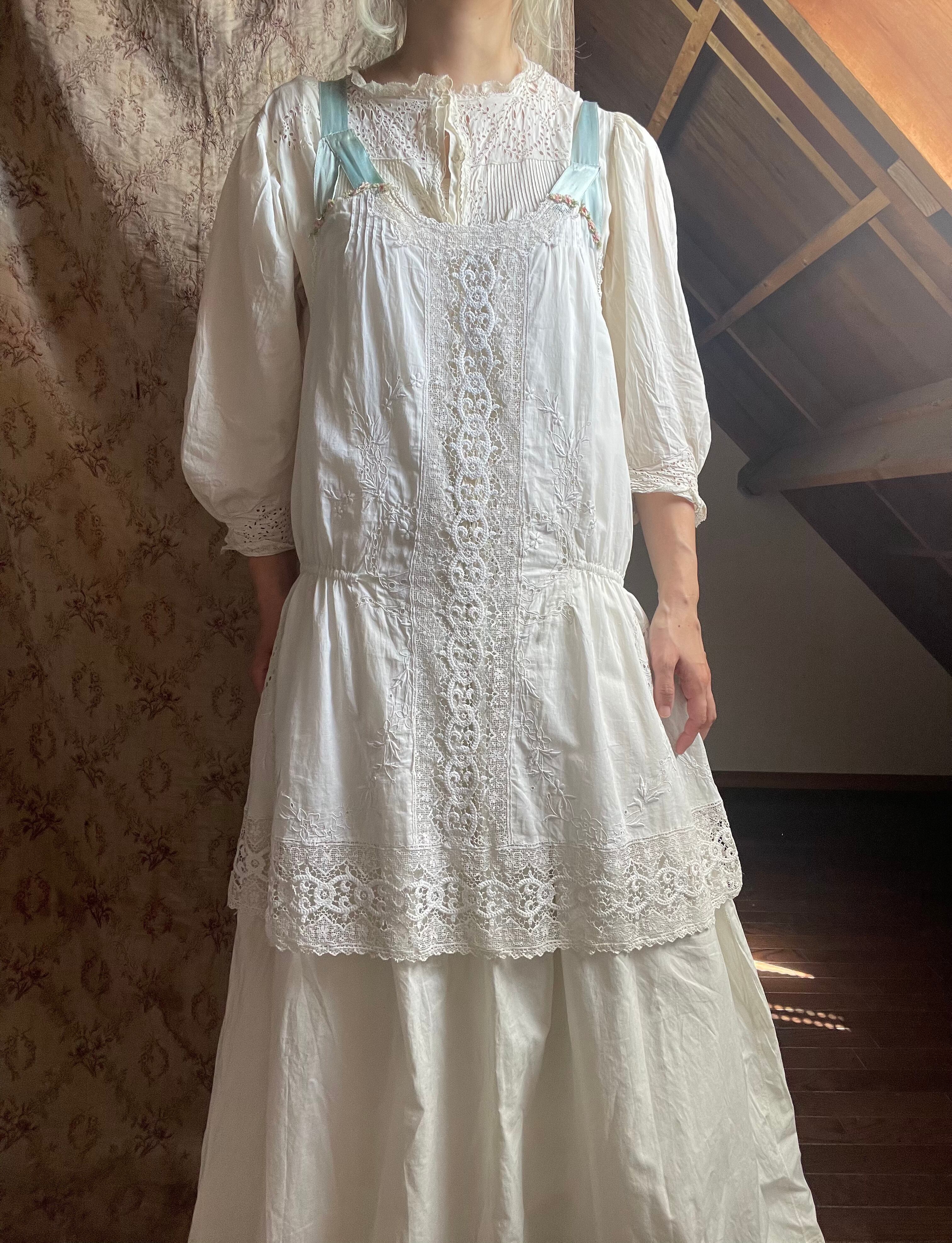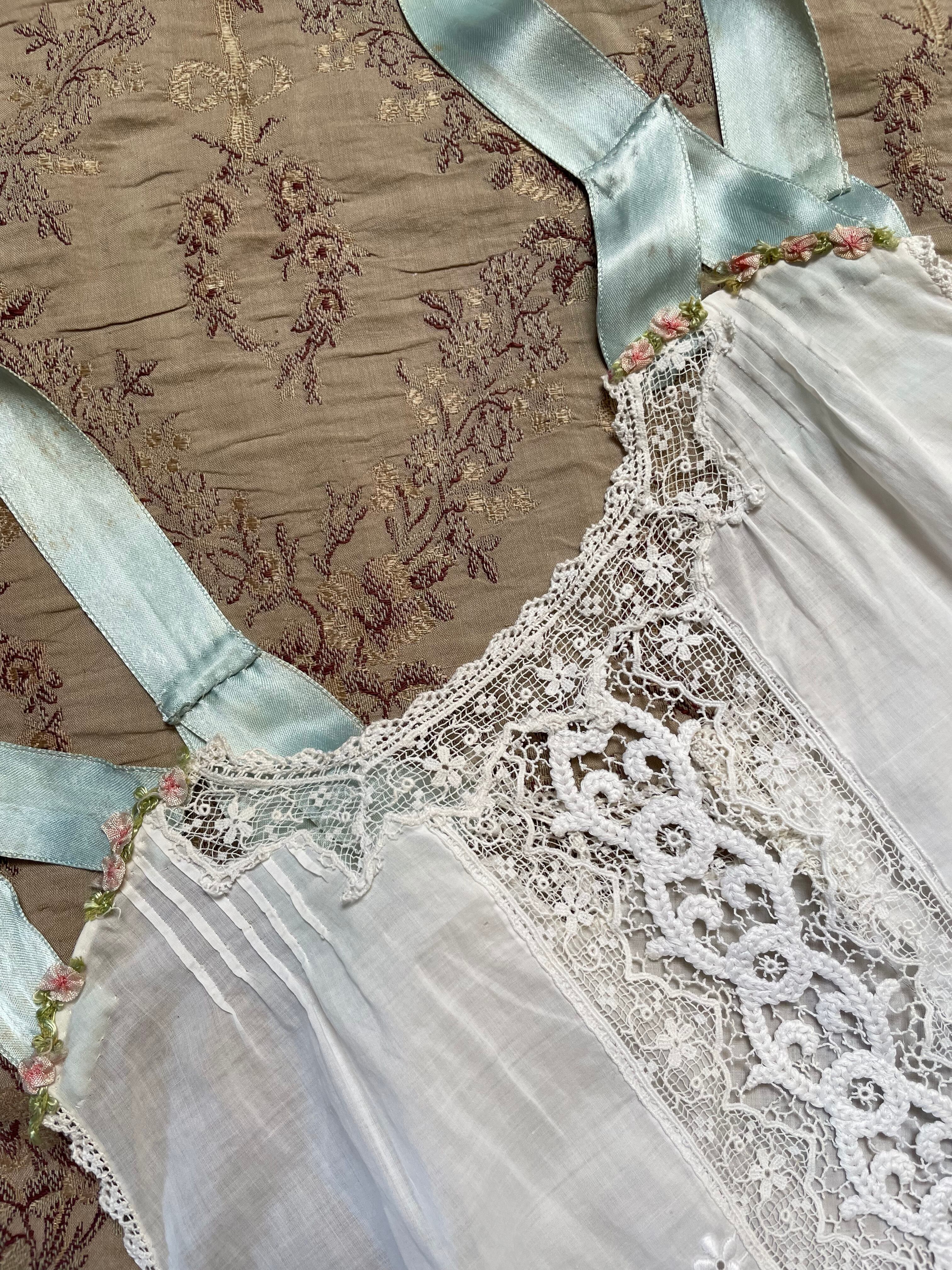 繊細なレース切り替えと、ロマンチックなおリボンや植物の刺繍に加え、肩紐にはロココリボンをあしらって、とびきり甘めな雰囲気に仕上げています♡