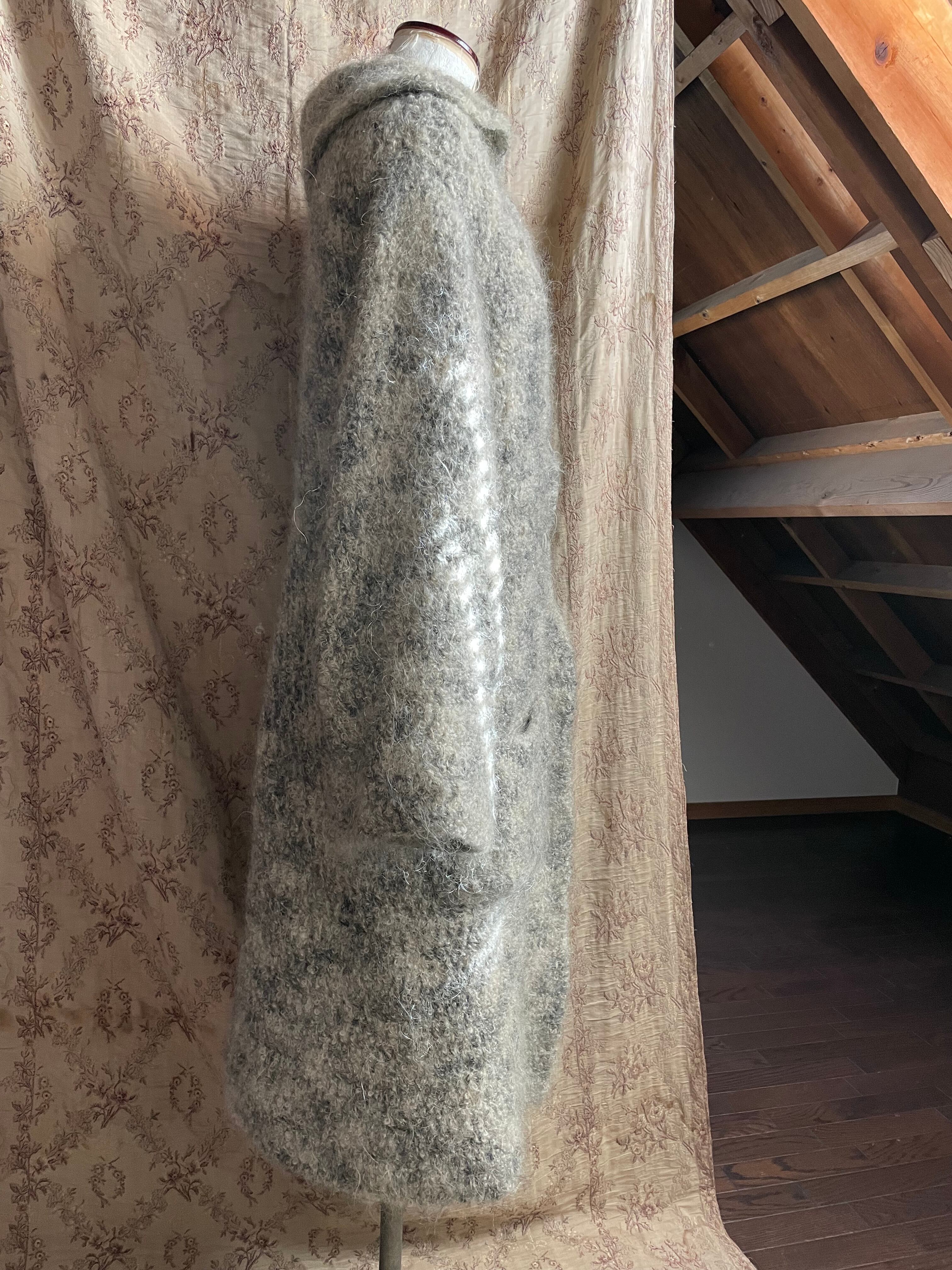 カーリーな毛糸で編まれているため、全体的にくるくるしており、また白とグレーの混ざり合ったメランジ柄なのも可愛いです♡