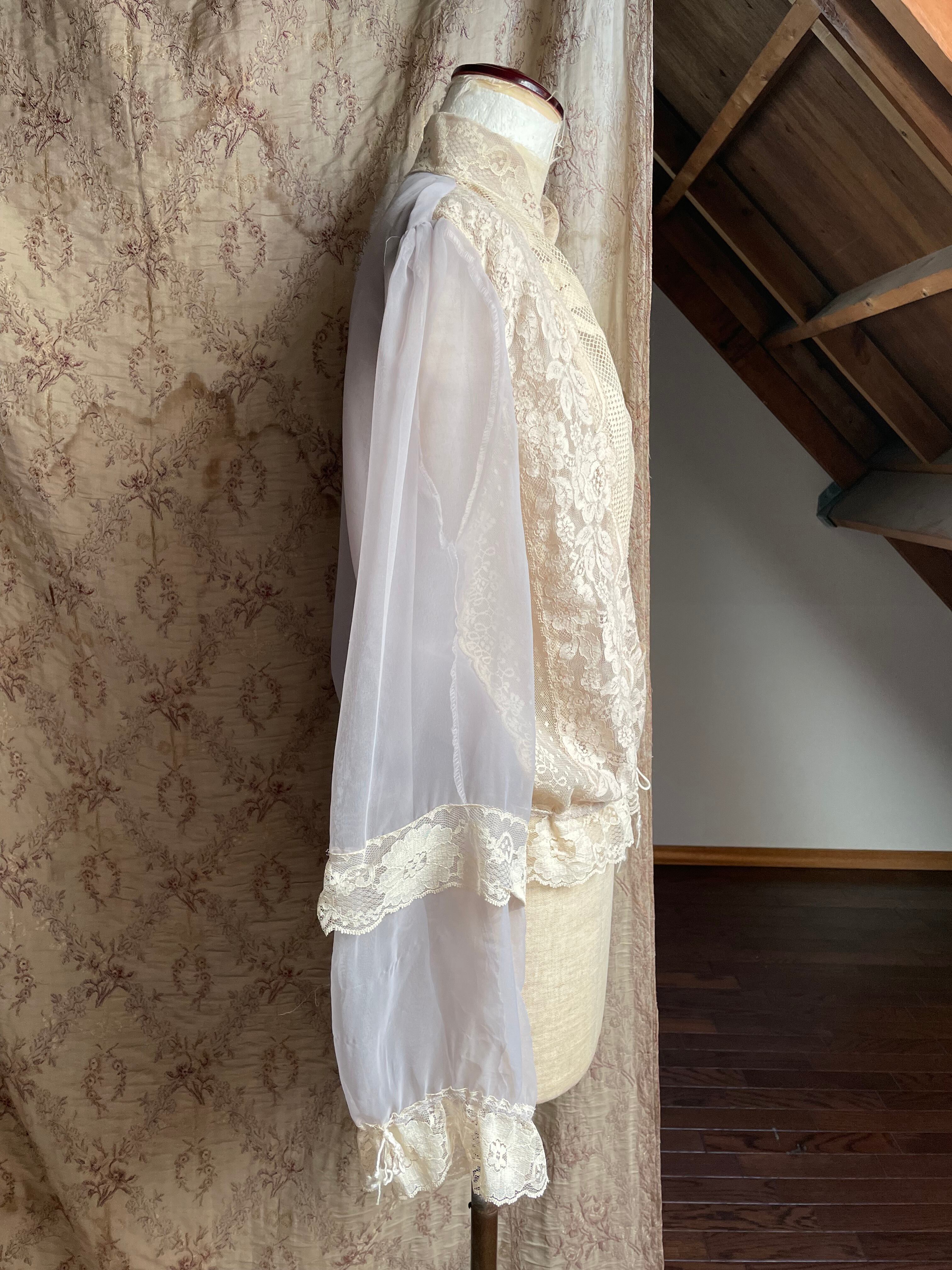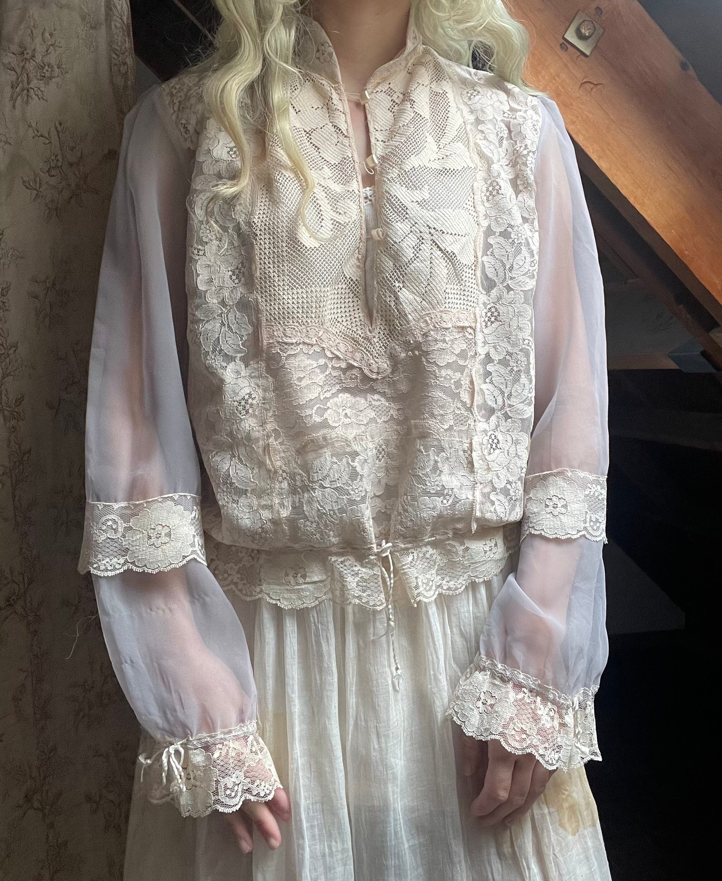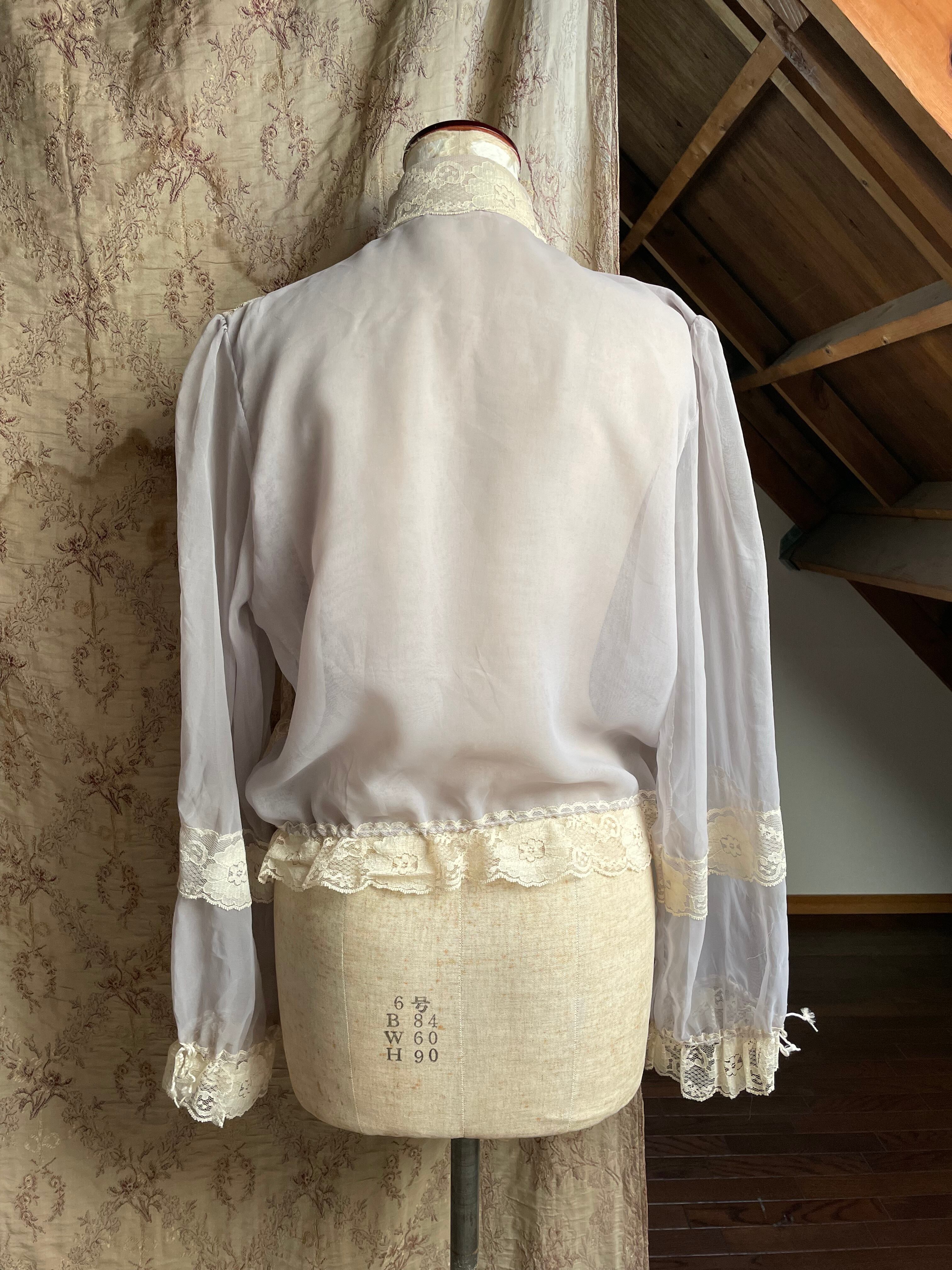 ラベンダー色の生地に生成色のレースの合わせがロマンチックで可愛いブラウスです♡