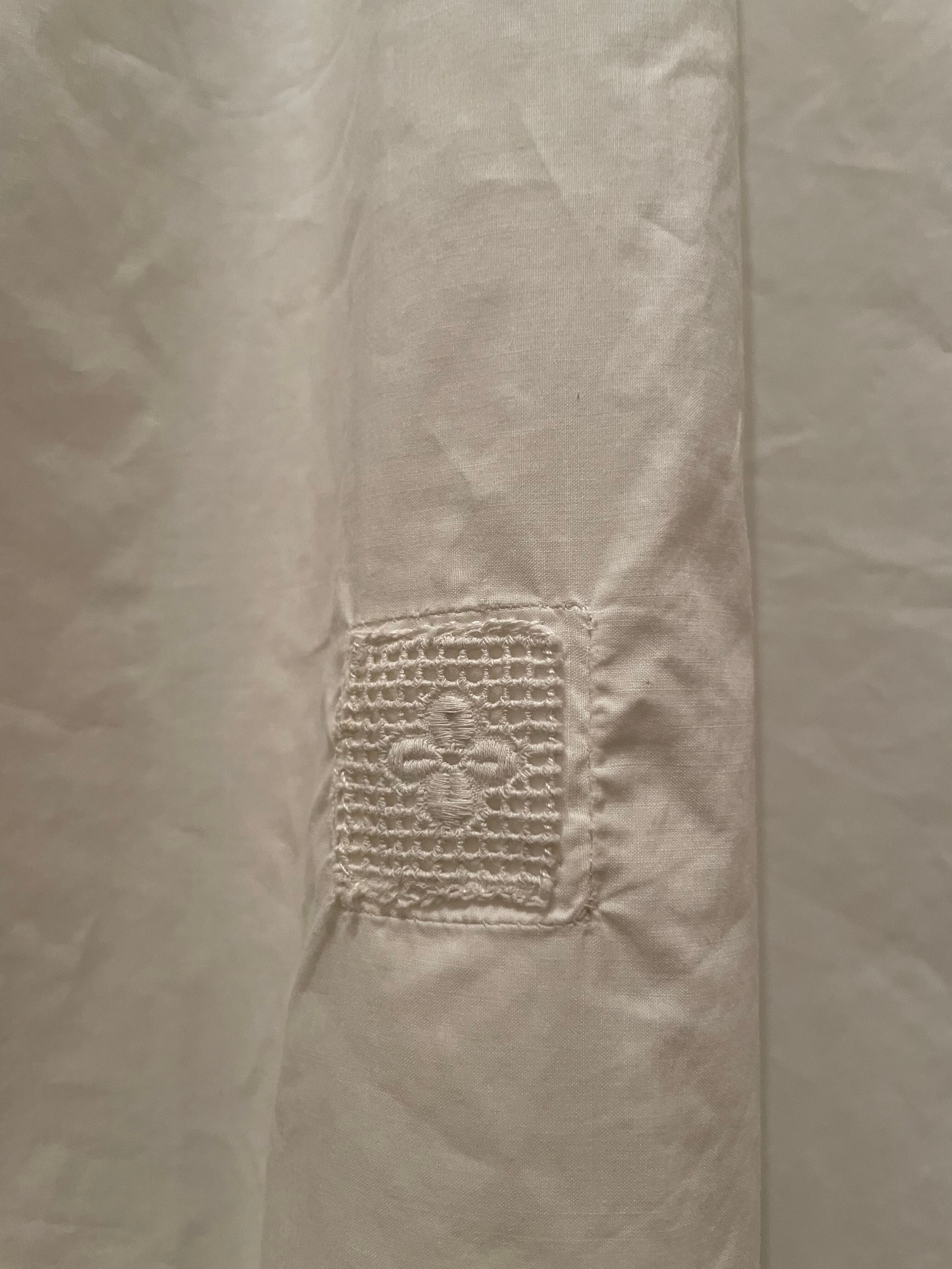 裾部分に、おそらくリペアのためにアップリケが施されたり、アンティーク特有の経年劣化による小さなシミがございます。