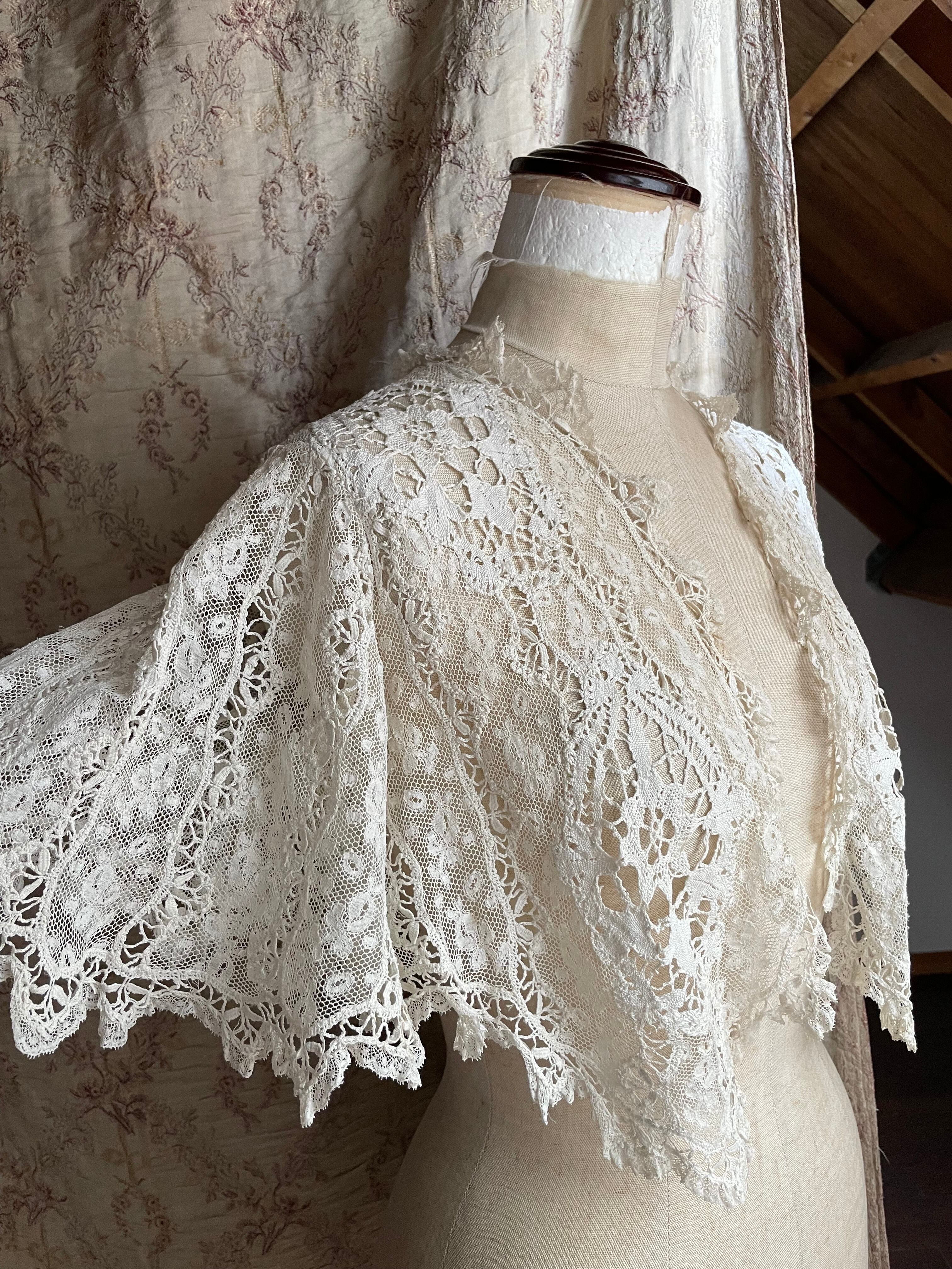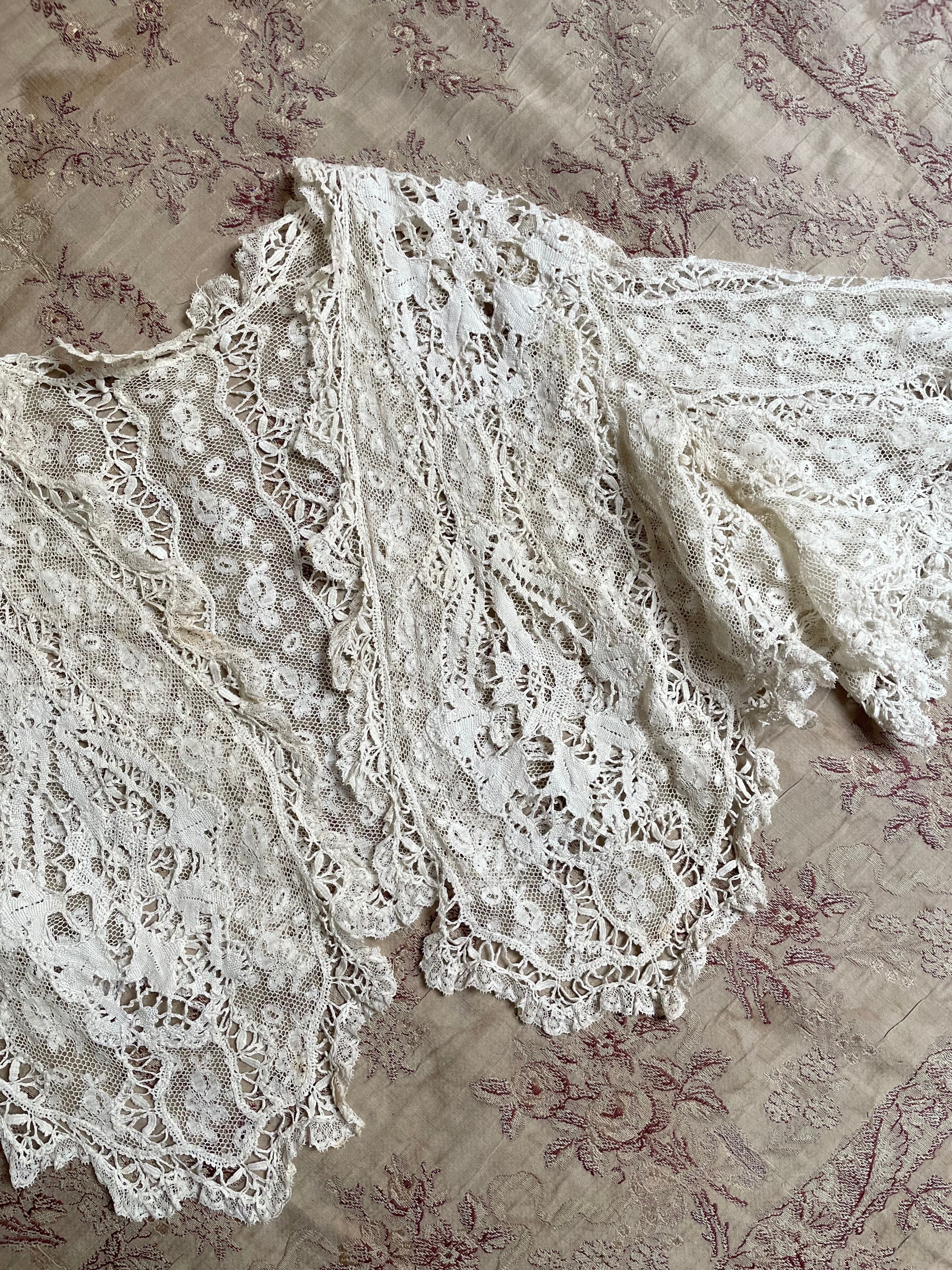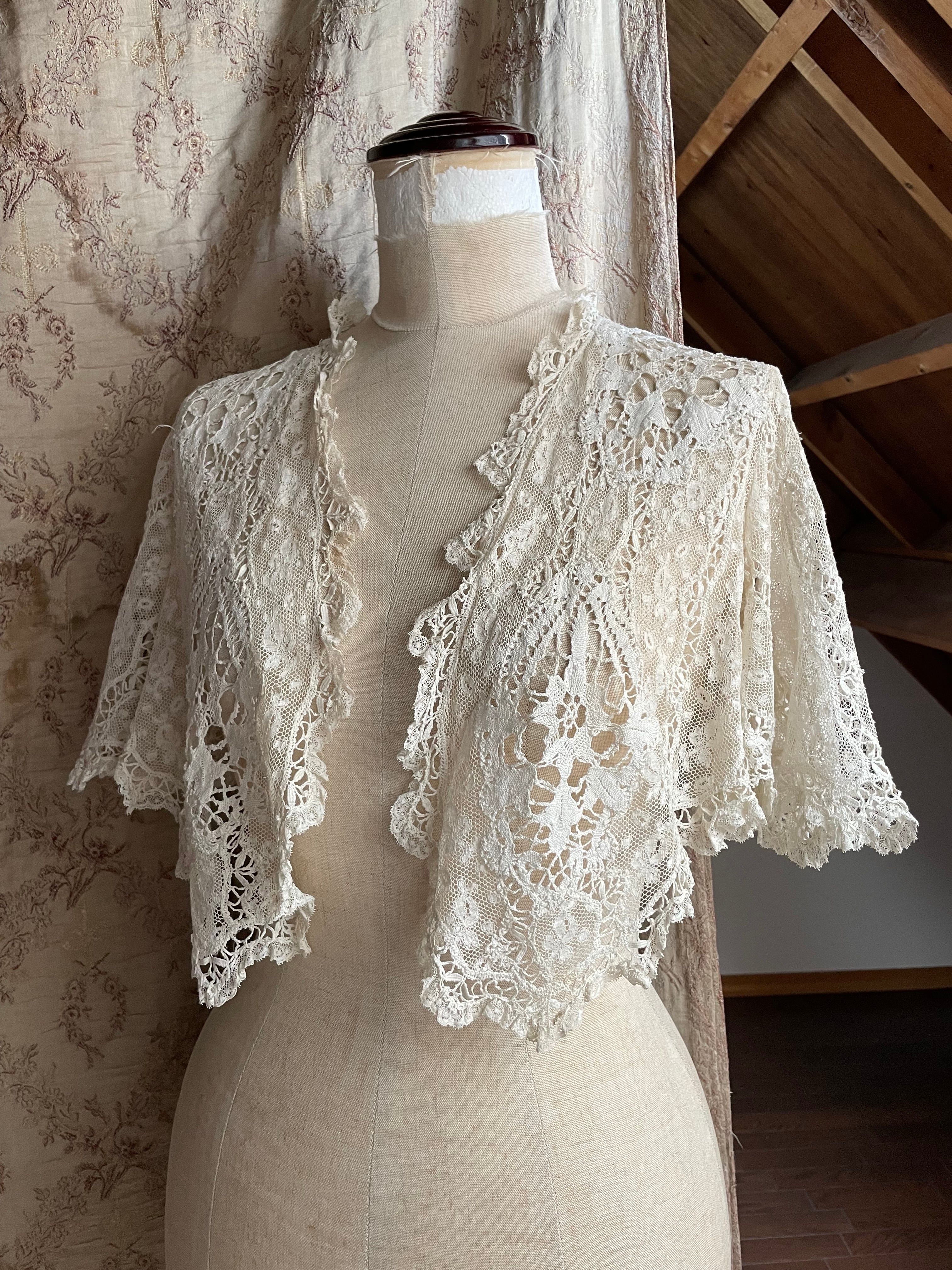 繊細な手織りボビンレースとアンティークならではの経年変化されたエクリュカラーがとっても上品な仕上がりです♡