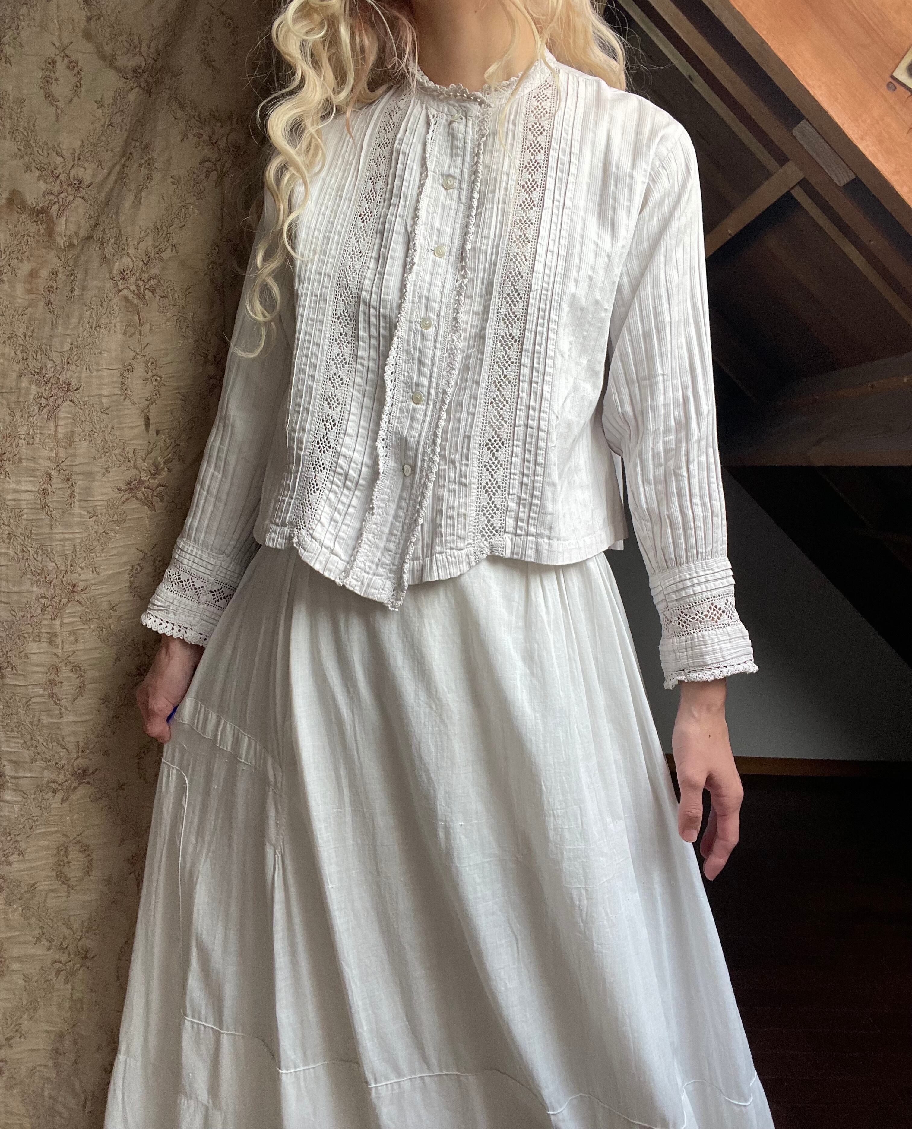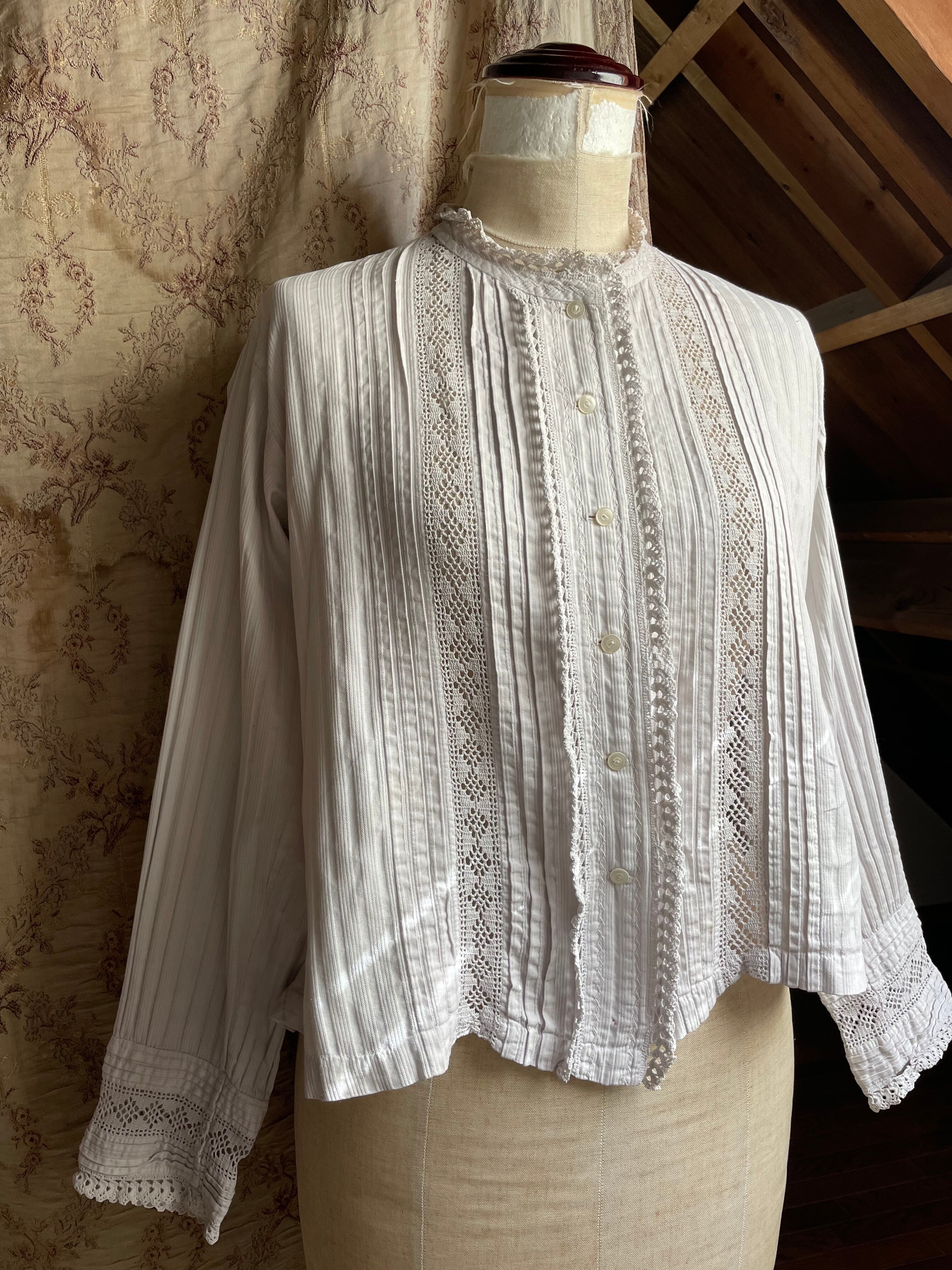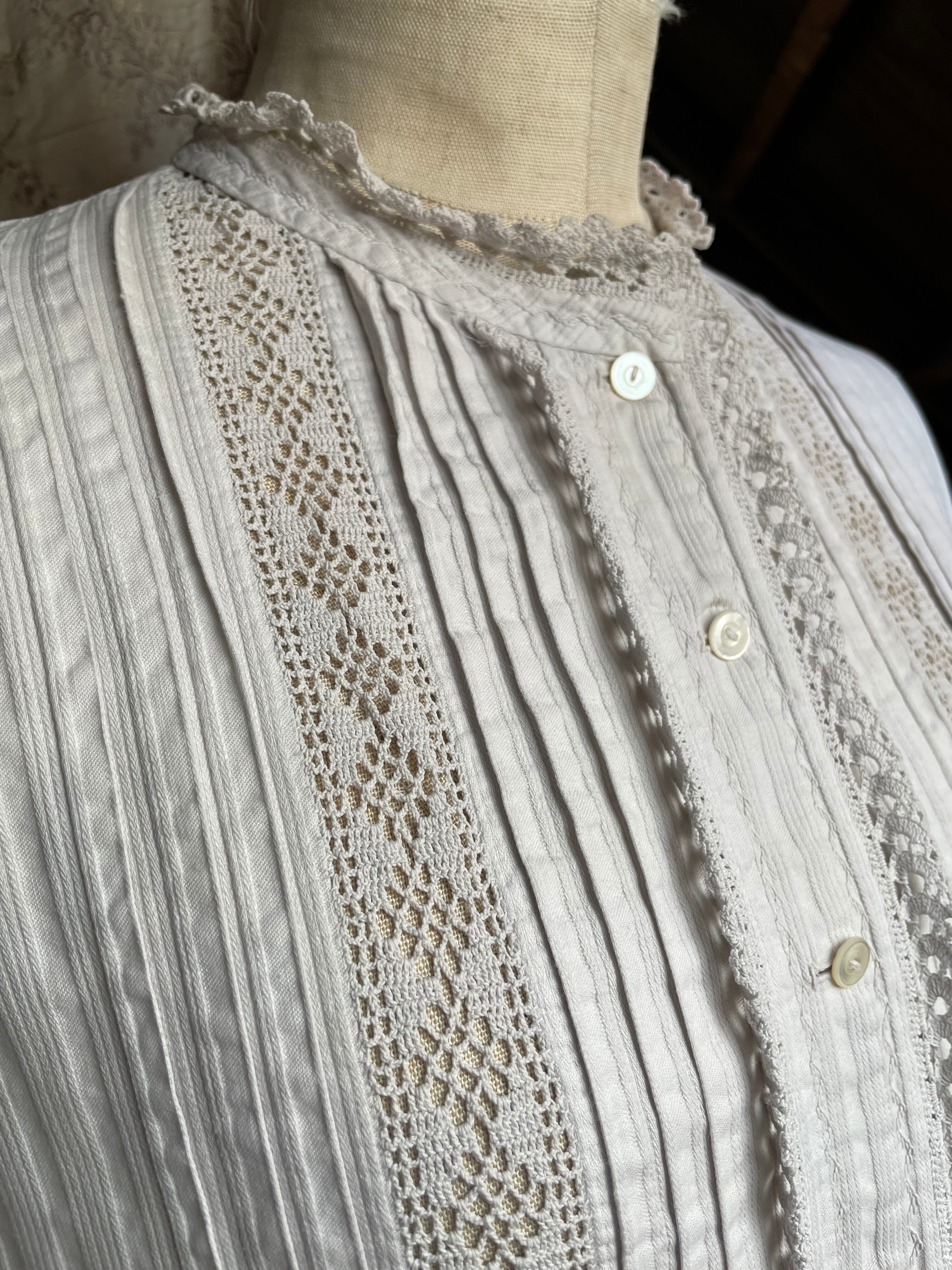 ストライプのような織り模様と、肉厚なクロシェレースの組み合わせが可愛い、フレンチブラウスの中では比較的ショート丈なブラウスです♡