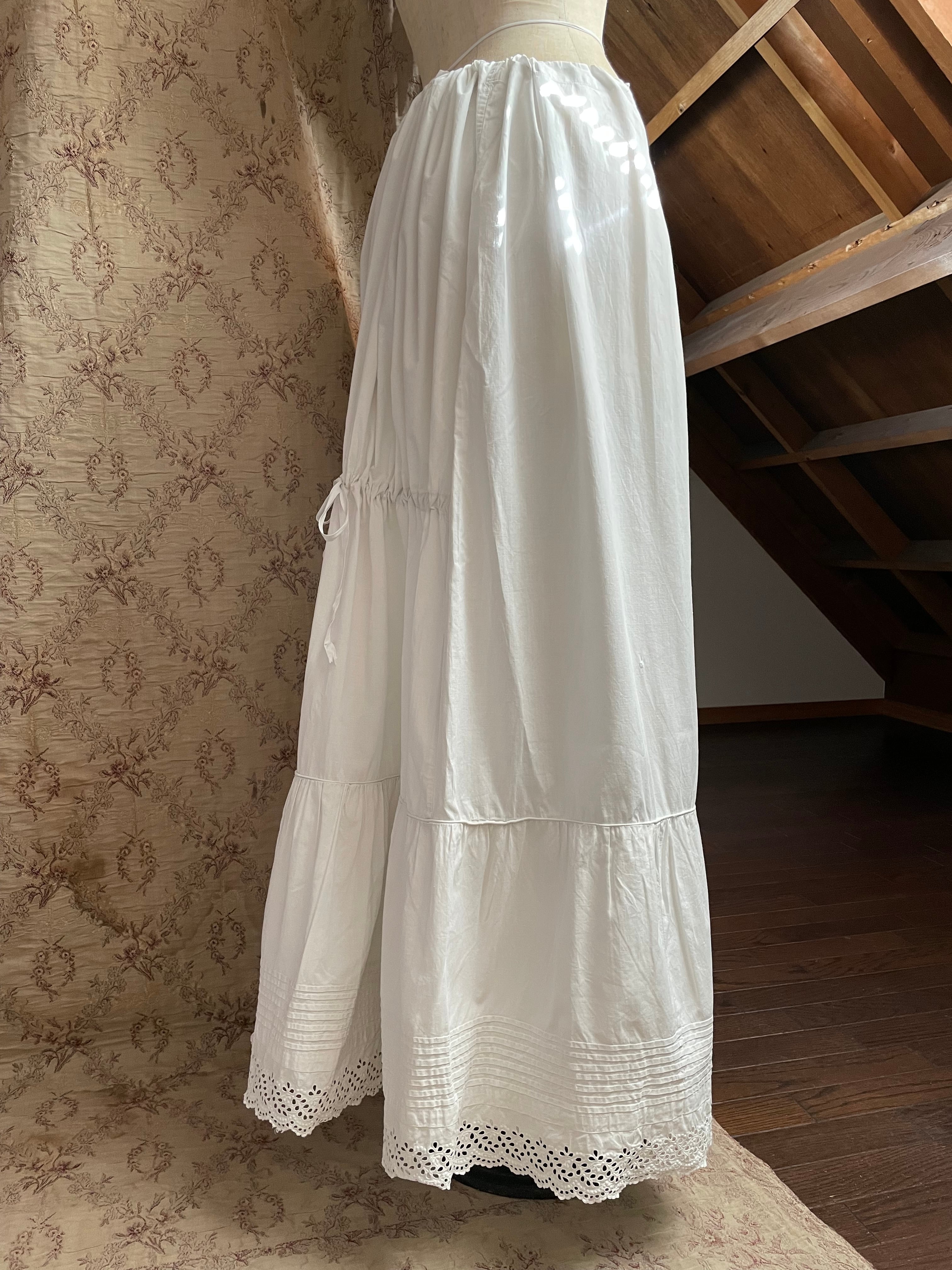 ウエストのイニシャル刺繍や裾のタック、カットワークレースがかわいく、ウエストには紐が入っており、ご自身のウエストや服の厚みに合わせてサイズを調節することができます♡